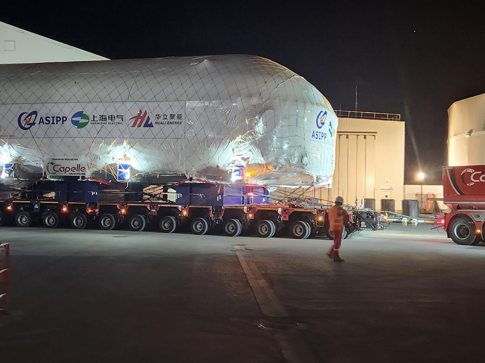 Le cryostat destiné à l'installation d'essai à froid des aimants d'ITER, dans lequel seront insérées certaines des bobines de champ toroïdal en forme de D ainsi que la PF1 (la plus petite des bobines de champ poloidal en forme d'anneau), a la forme d'une boîte de sardines géante. Mesurant 22 mètres de long et près de 11 mètres de large, pour un volume total de 1 400 mètres cubes, cet élément a posé des défis uniques aux opérateurs du convoi, ce qui explique la durée exceptionnelle du transport. Jusqu'à présent, aucun convoi ITER n'avait mis plus de quatre nuits pour parcourir l'itinéraire ITER.