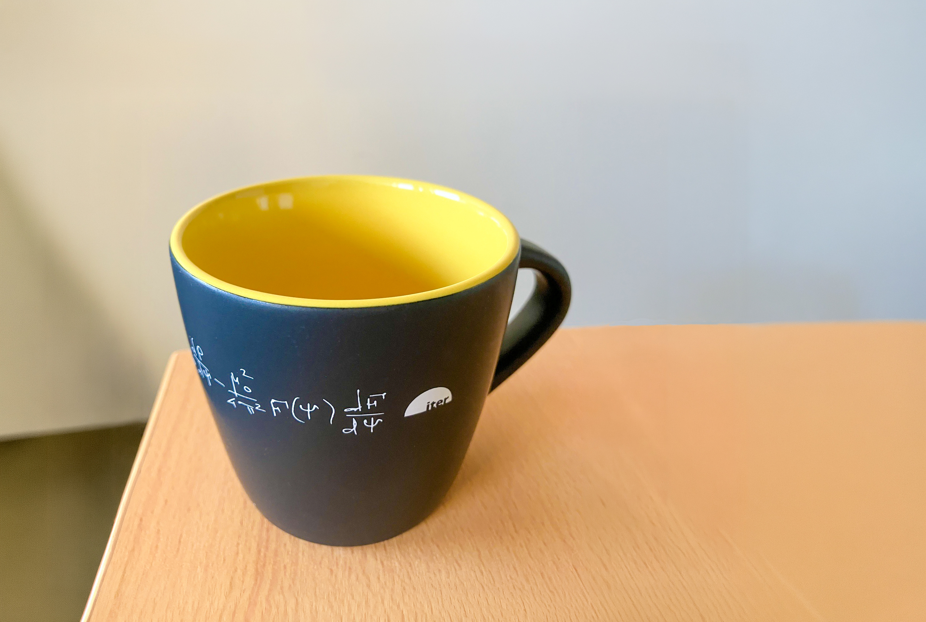 Dans les bureaux d'ITER, les tableaux blancs couverts d'équations de physique font partie du décor. Plus inattendu : une tasse à café bleu foncé sur laquelle est inscrite l’une de ces équations en caractères manuscrits. Il ne s'agit toutefois pas de la formule la plus directement associée à la fusion, celle qui décrit la réaction deutérium-tritium. Alors, d'où vient cette équation ?