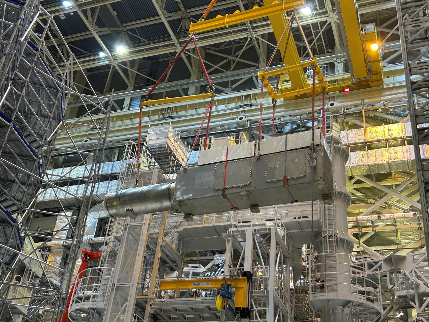 Une centaine de gros équipements doivent être installés dans le Bâtiment tokamak afin de créer le réseau de lignes d’alimentation des bobines. L’équipe d’assemblage les subdivise en deux catégories : d’une part, les « éléments de galerie », qui sont les segments des lignes d’alimentation installés à l’extérieur (et au contact) de l’enceinte sous vide qui isole la machine, et, d’autre part, les segments « intra-cryostat », qui sont situés de l’autre côté de cette enceinte et directement raccordés aux aimants. Un pas décisif a été franchi ce mois-ci lorsque les équipes ont mis en place le 62e, et dernier, des éléments situés dans les galeries.