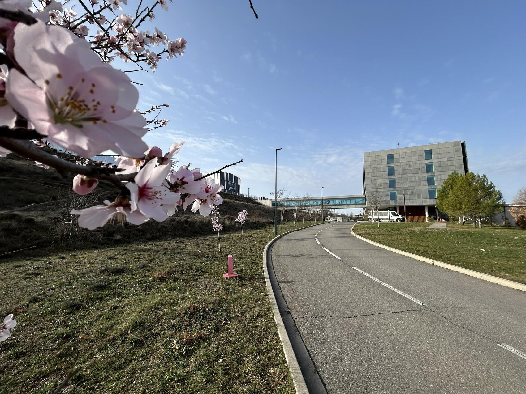 2026-03-04 - Des cerisiers bordent la route qui mène à l'entrée du site. Cette semaine, les fleurs se sont épanouies, pour le plus grand plaisir des passants.