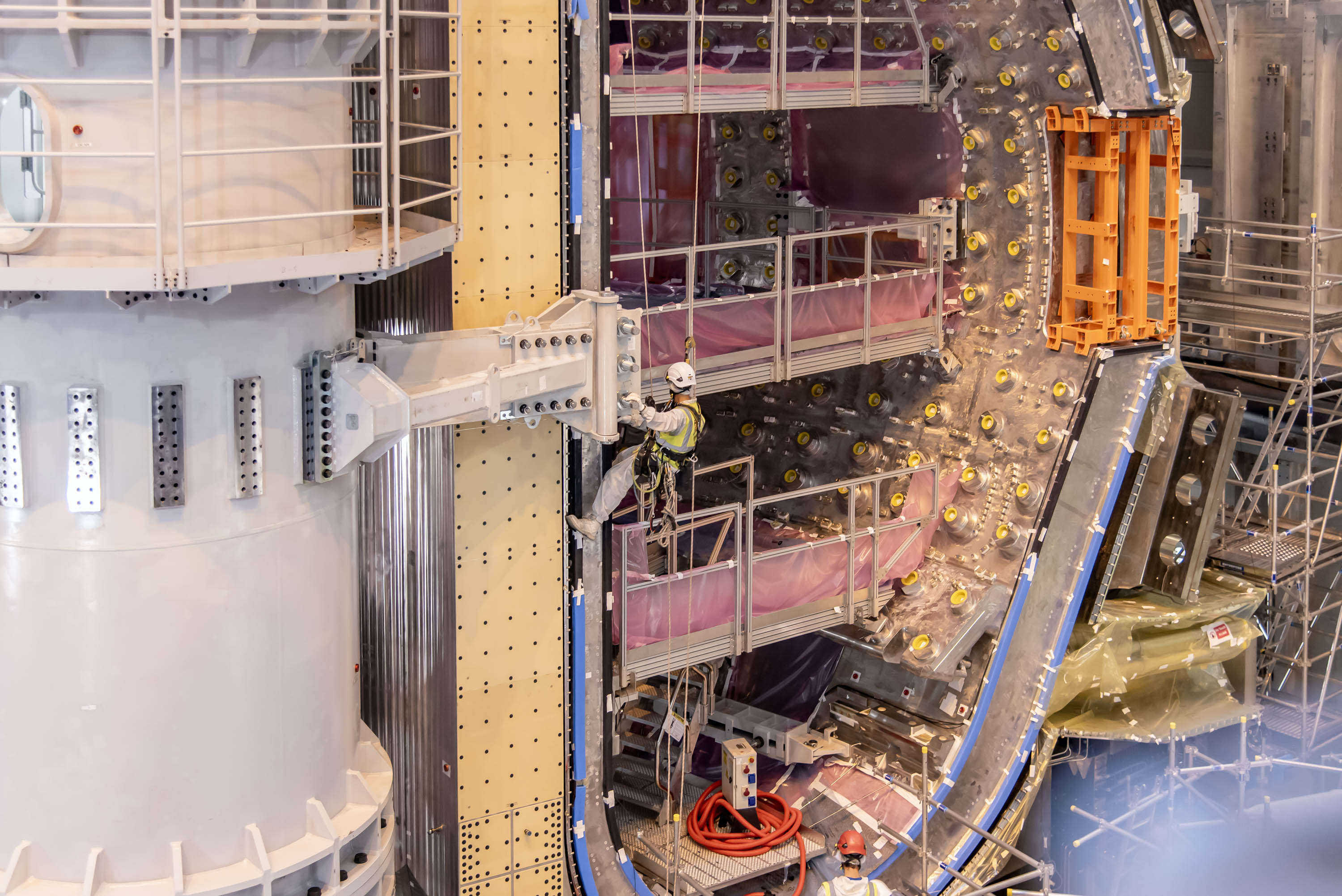 2025-10-28 - Un collaborateur du consortium CNPE descend en rappel le long d'un des immenses secteurs de la chambre à vide installé dans le puits d'assemblage, en passant devant les échafaudages installés pour permettre aux équipes d'accéder à tous les recoins de l'intérieur.