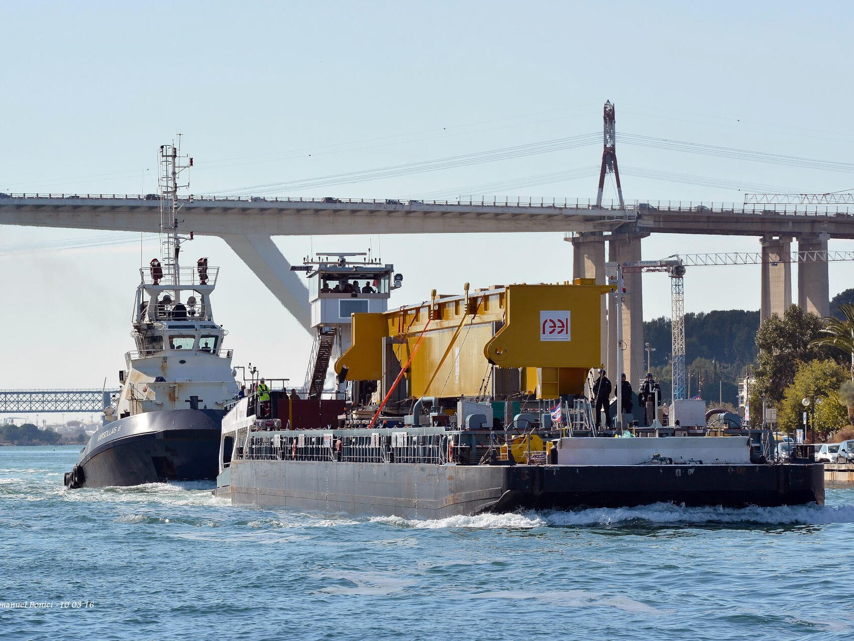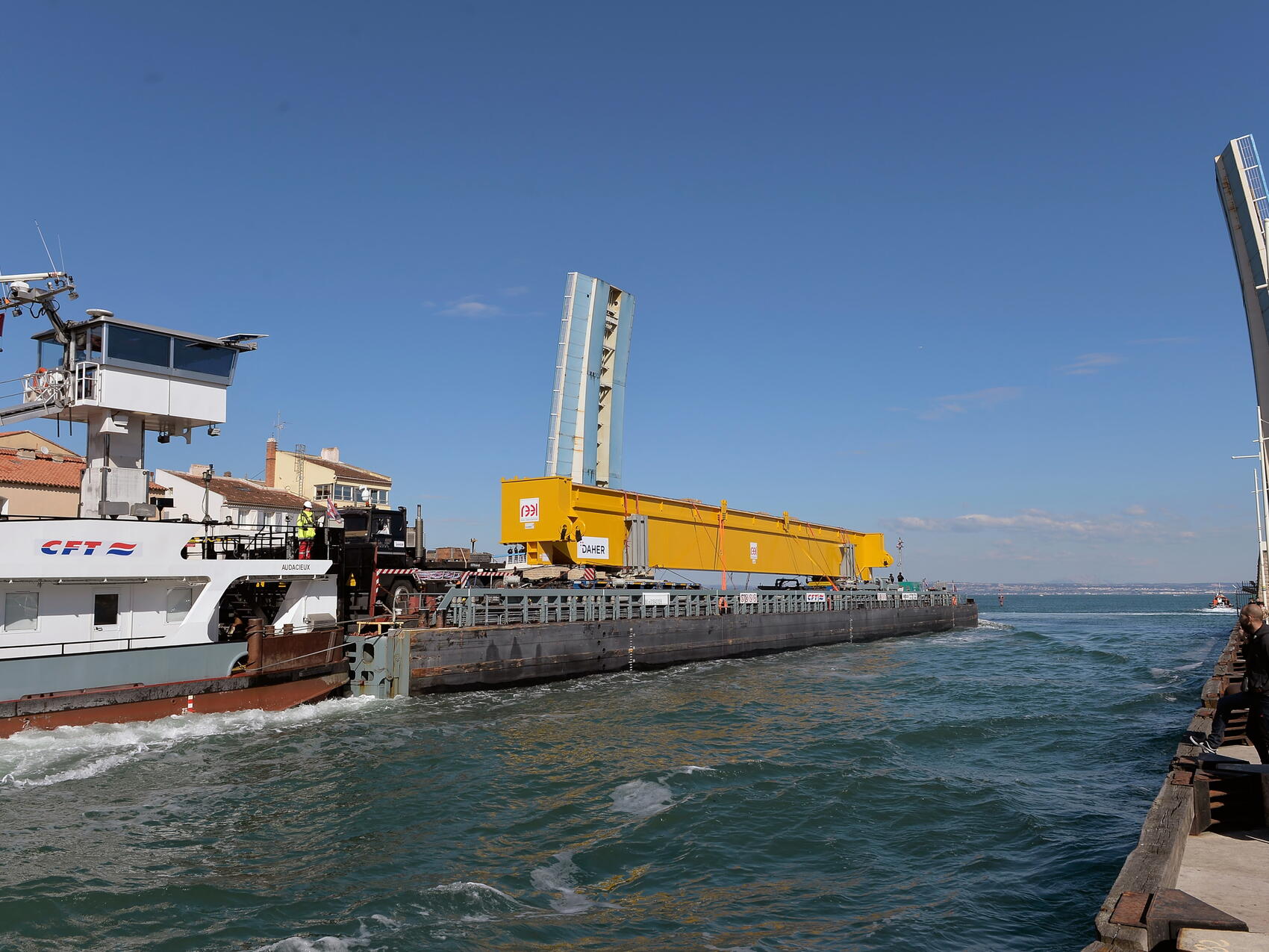 Manufactured in Aviles, Spain, for the European Domestic Agency, the first pair of girders reached the Marseille industrial harbour of Fos-sur-Mer on 8 March. Girder #1 was transferred the next day to a specially designed barge for a four-hour voyage across the inland sea Etang de Berre.