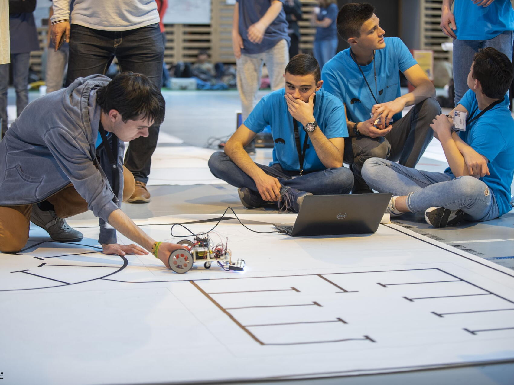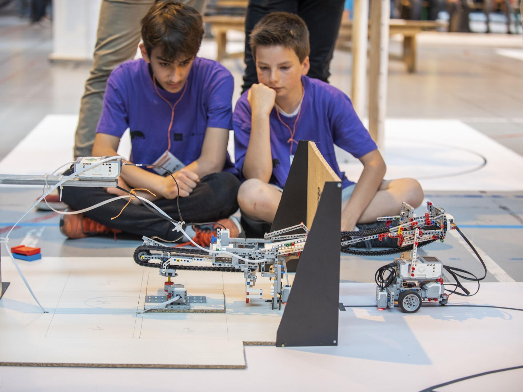 Each participating school can be identified by the colour of its T-shirt, and the gym seems lit with a vibrant rainbow of excitement. Lying on the floor, hunched over a robot made from LEGO Mindstorm components, a student tinkers with some final adjustments, listening intently to feedback from one of the facilitators in an orange cap. "The lighting is different in the gym here than it was in our school," he says with some trepidation. This is a common theme—that a last-minute surprise during the final competition derails months of hard work and practice.