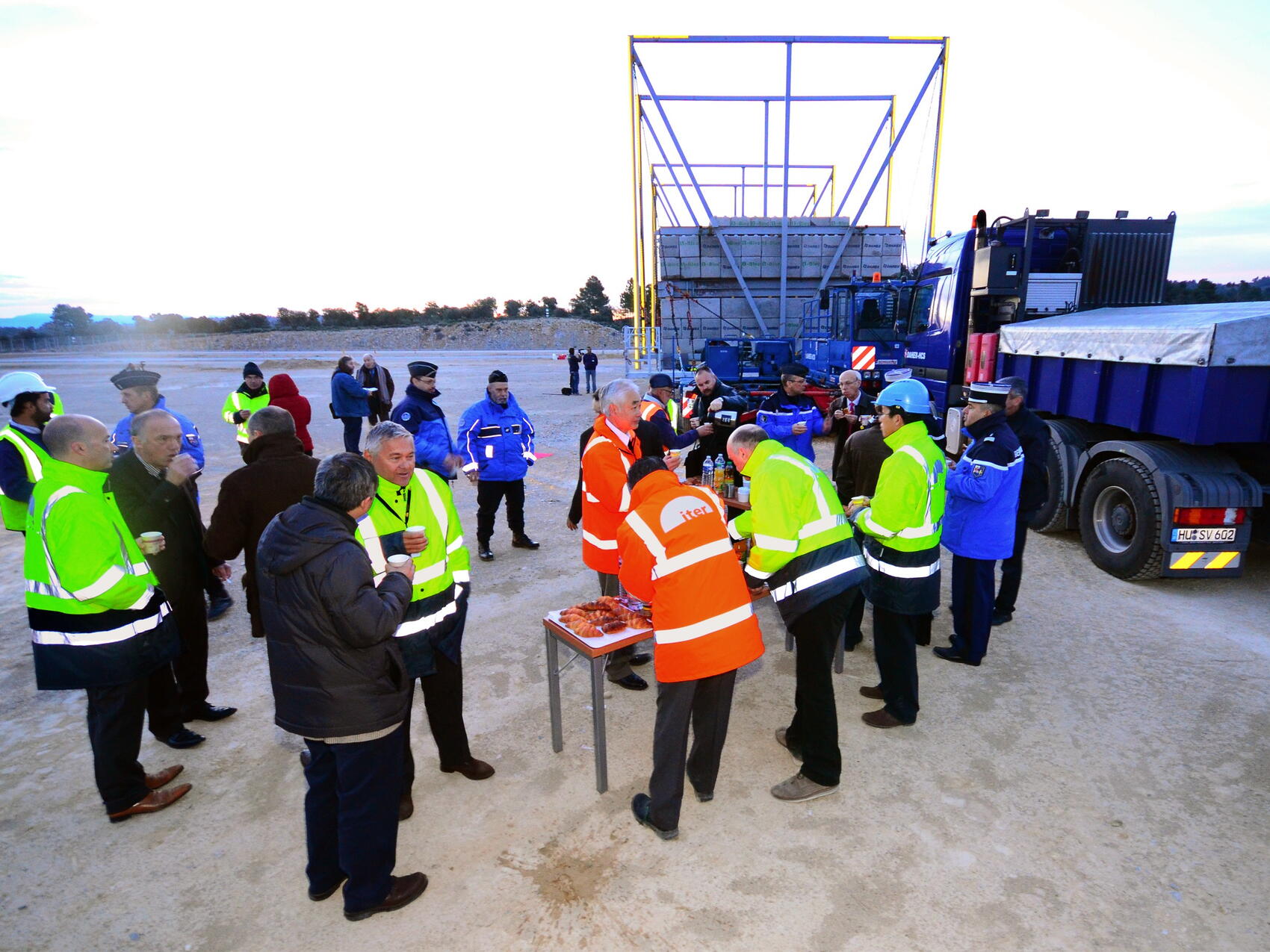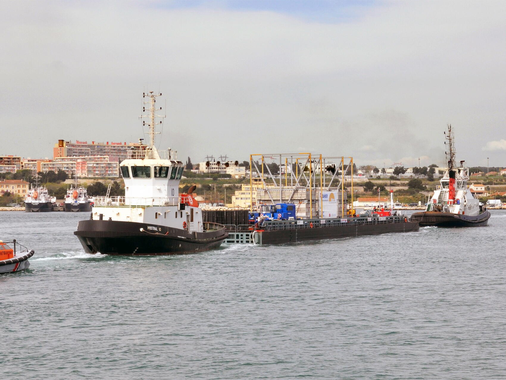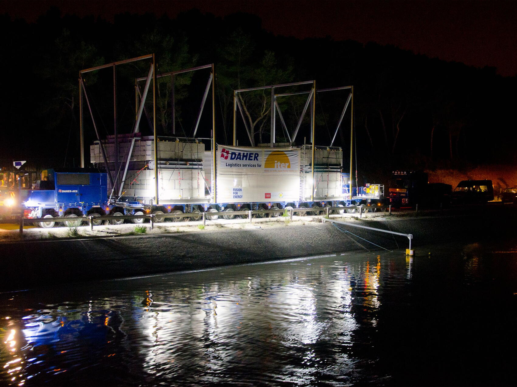 2014-12-14 - The ITER Itinerary is tested a second time in 2014, including the maritime leg of the journey to the ITER site. In the picture, the 33-metre-long customized trailer and its mock load of concrete blocks (800 tonnes) is transported by barge along the Canal de Caronte, which connects the Mediterranean and the inland sea Etang de Berre.
