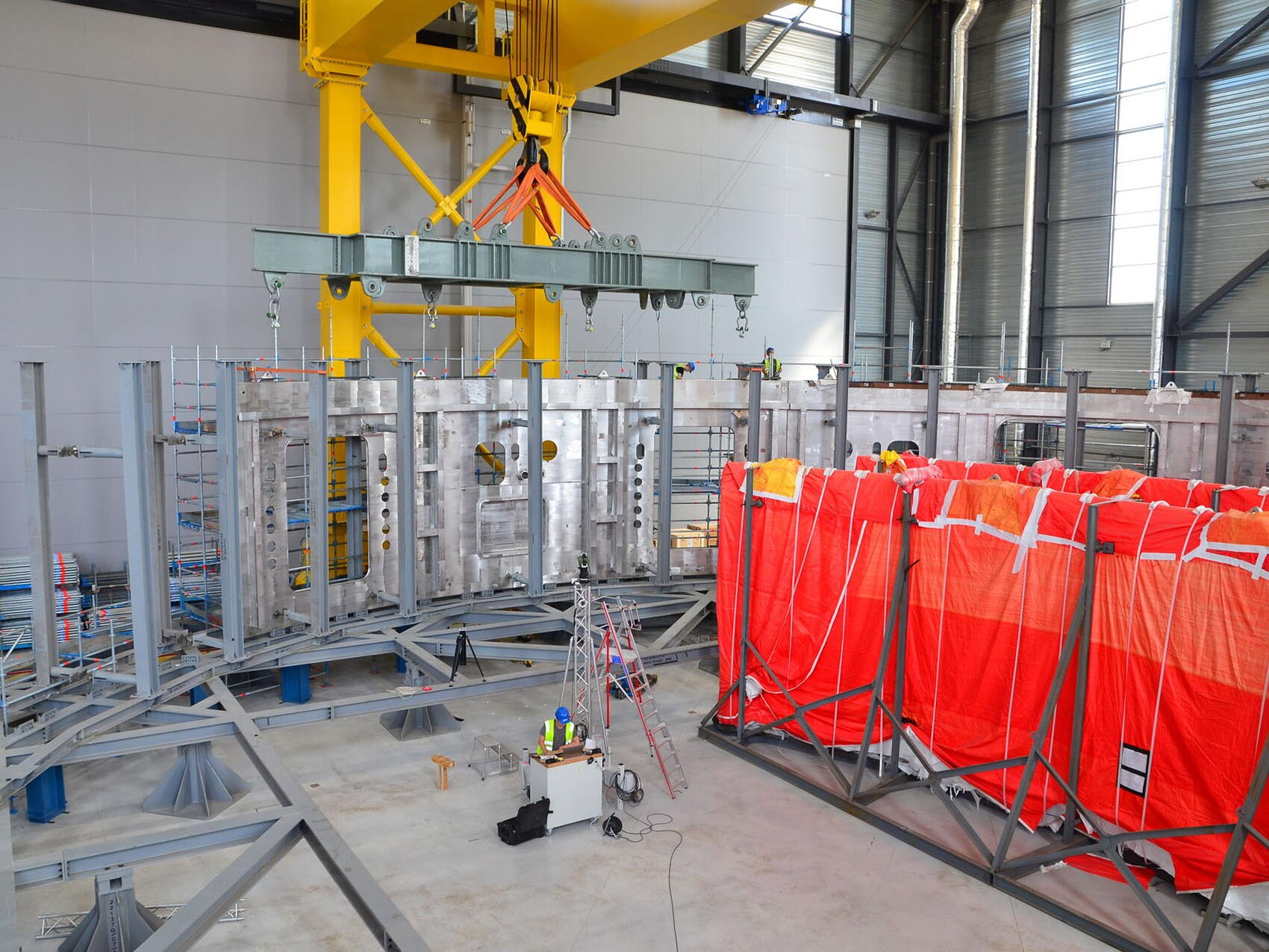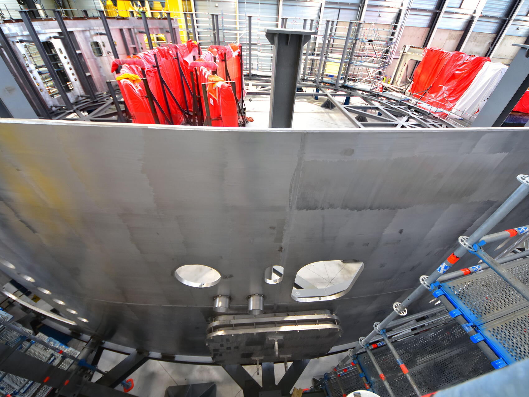 The three segments of the lower cylinder that are already positioned on the assembly frame help us to visualize what the completed cryostat will look like: a huge cylindrical steel vessel pierced with dozens of openings. Some are perfectly circular, some are the size of an average window with rounded angles, and a few are as high and wide as a cathedral door.