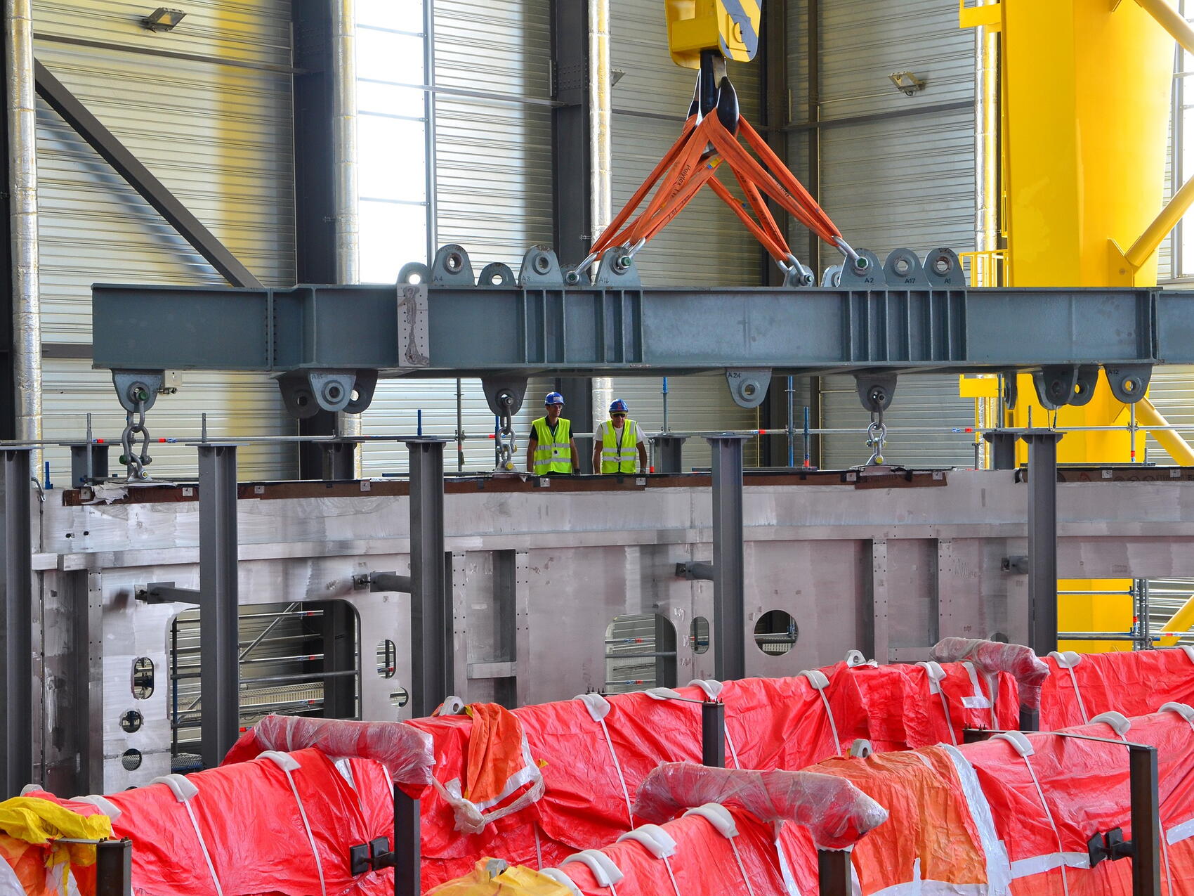 The space between the two work areas is almost fully occupied by large steel elements, as yet unwrapped and waiting to be assembled.