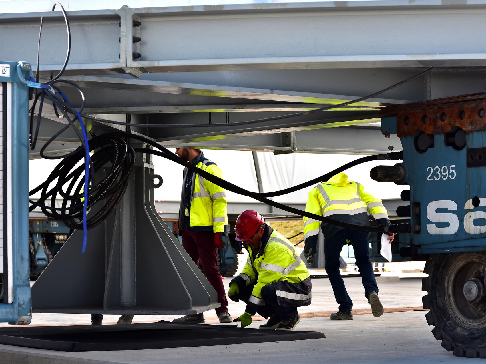 Transferring the near-500-tonne load from its assembly site to the storage area a few dozen metres away required no less than four self-propelled modular transporters arranged in a square and moving in perfect coordination. Particularly impressive was the sharp 90-degree turn that the trailers had to take in order to reach the storage area—192 independent wheels slowing rotating at different angles, like small appendages of a powerful living organism.