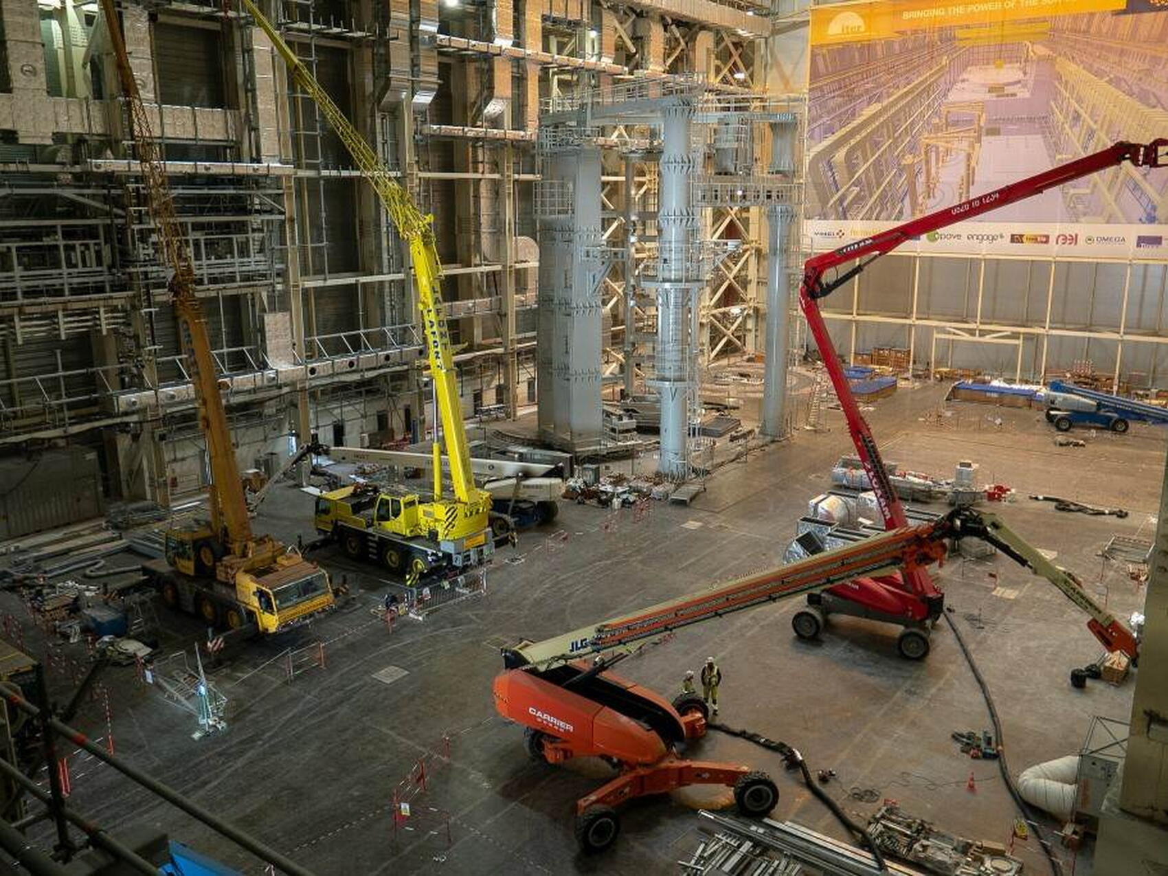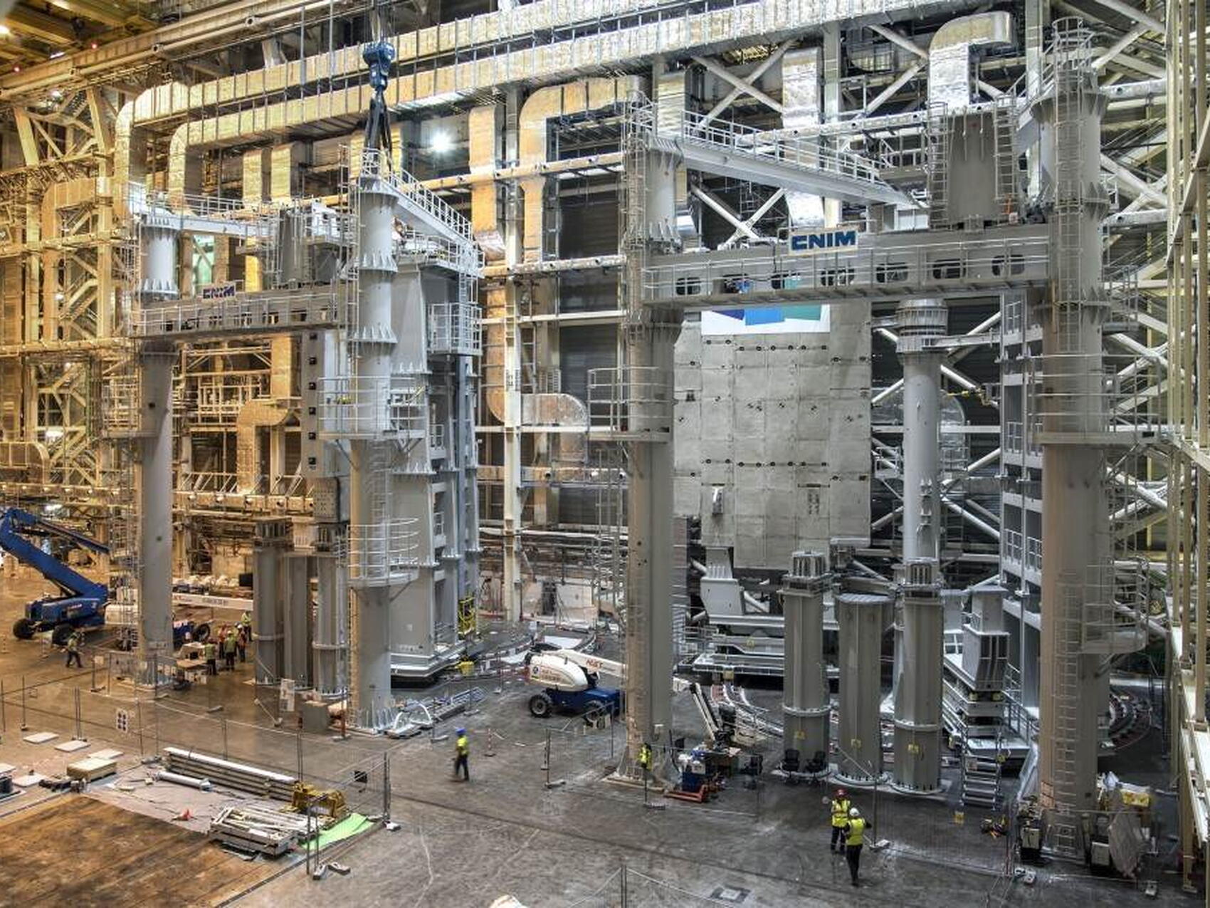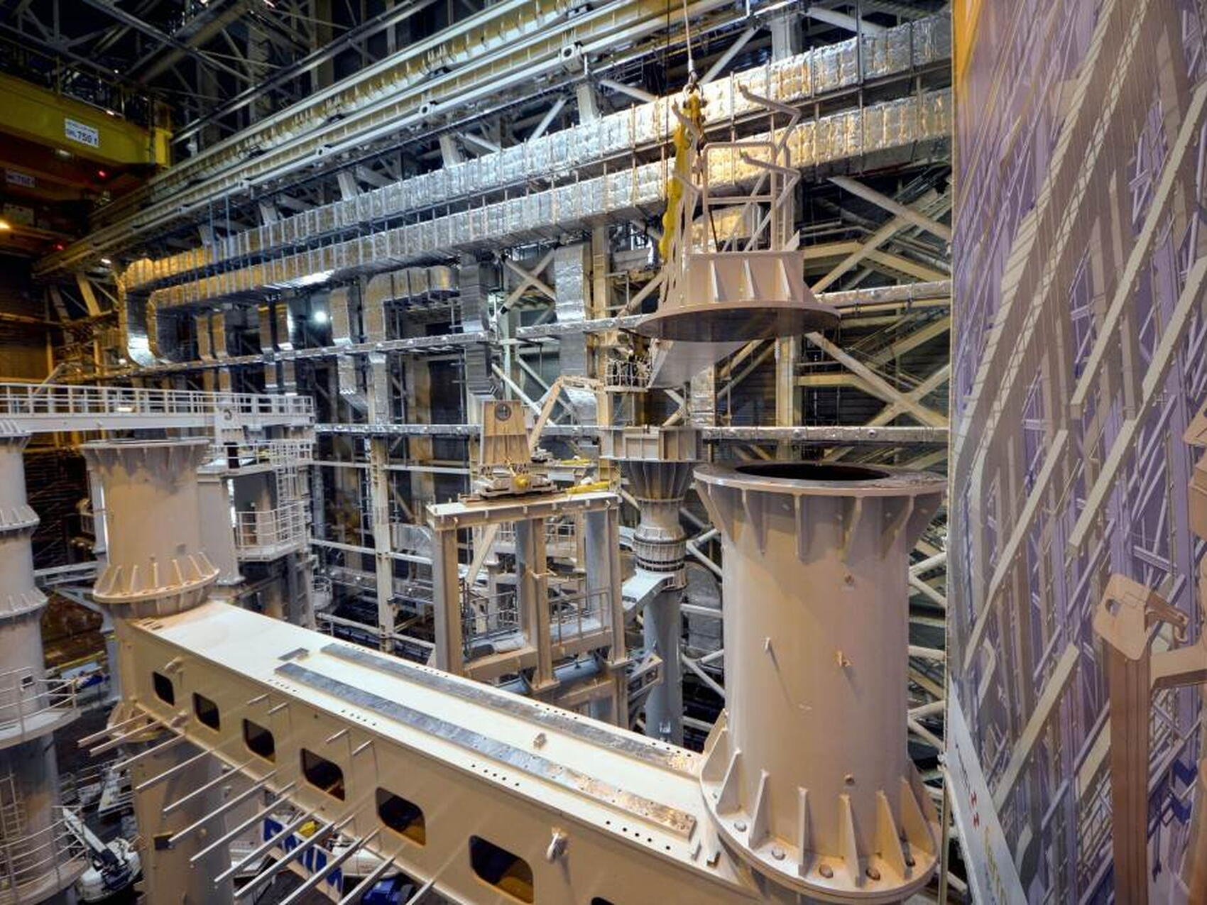 Au plafond: un système de levage composé de deux ponts roulants. Au sol: des outils spécifiques pour assembler, soulever et manœuvrer vers leur emplacement définitif les composants monumentaux d'ITER.