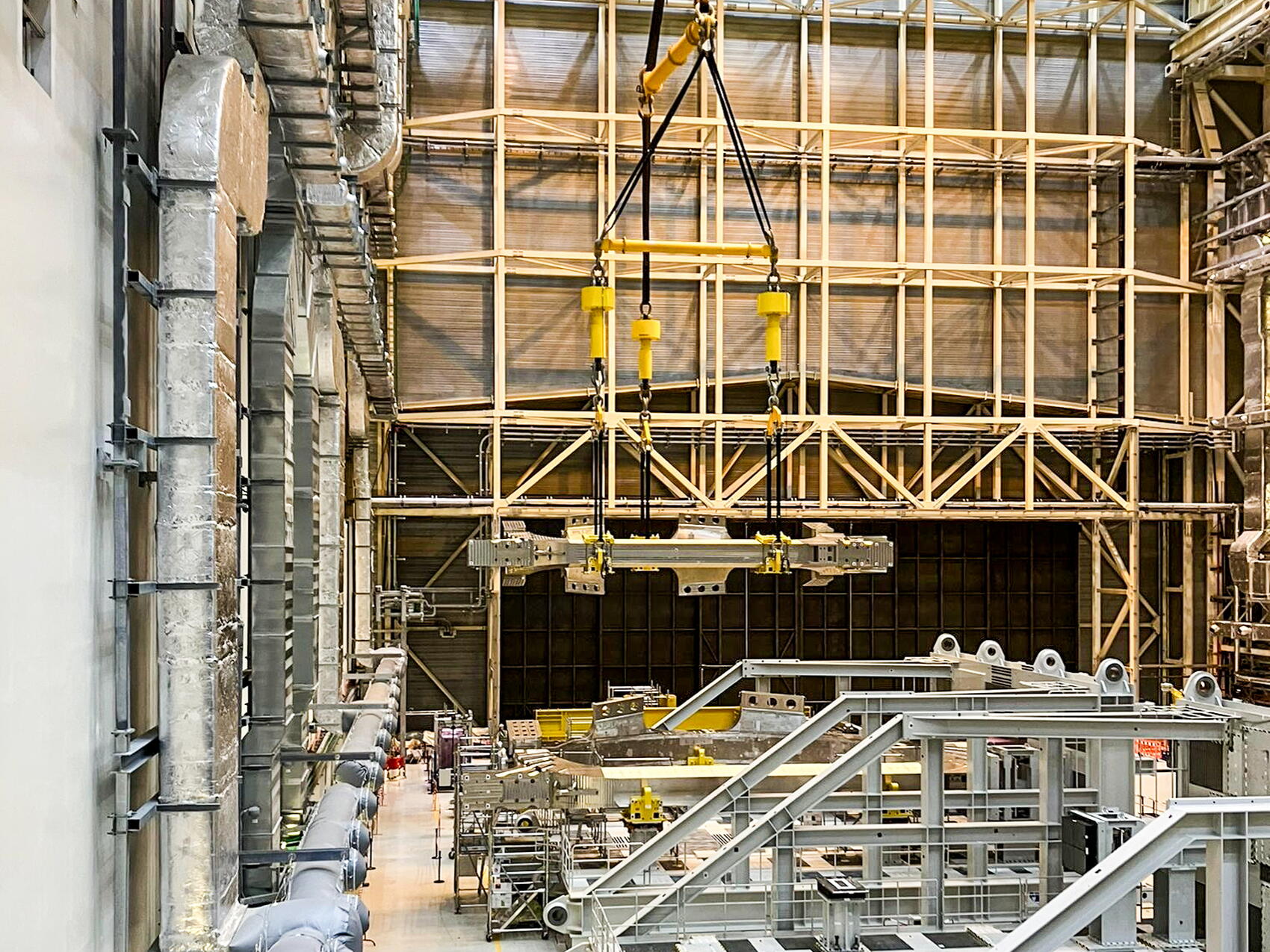 2026-02-12 - The 400-tonne "bare" sector is transported over the transversal beam of the tall tool. Once it has been docked, work will begin to make it a "sector module."