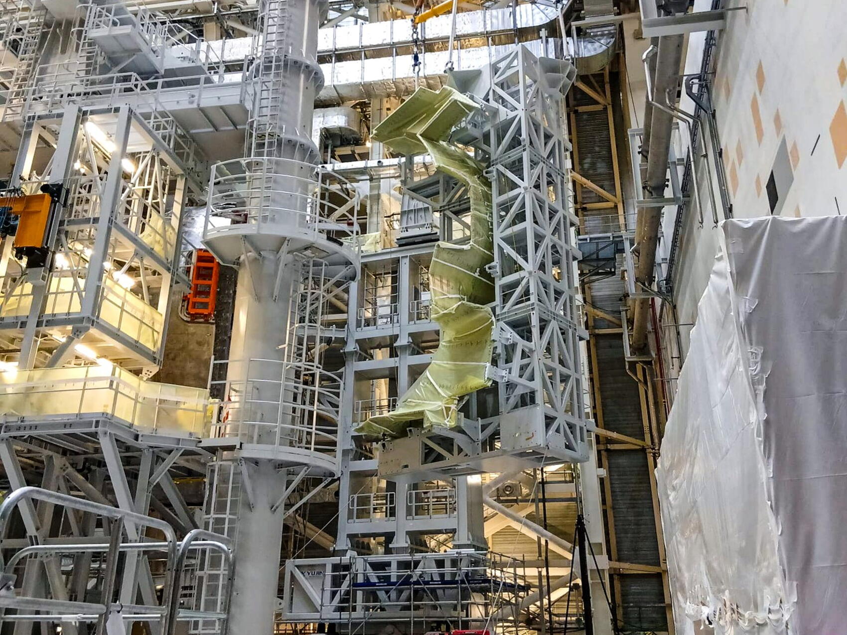 2026-01-28 - Late at night, on Wednesday, 28 January, sector module #8 is positioned above its landing position, but adjustments must still be made. A special lift attachment between the overhead cranes and the load is equipped with a balance control system that can perform horizontal-plane load adjustments along the X and Y axes. Another allows it to pivot.