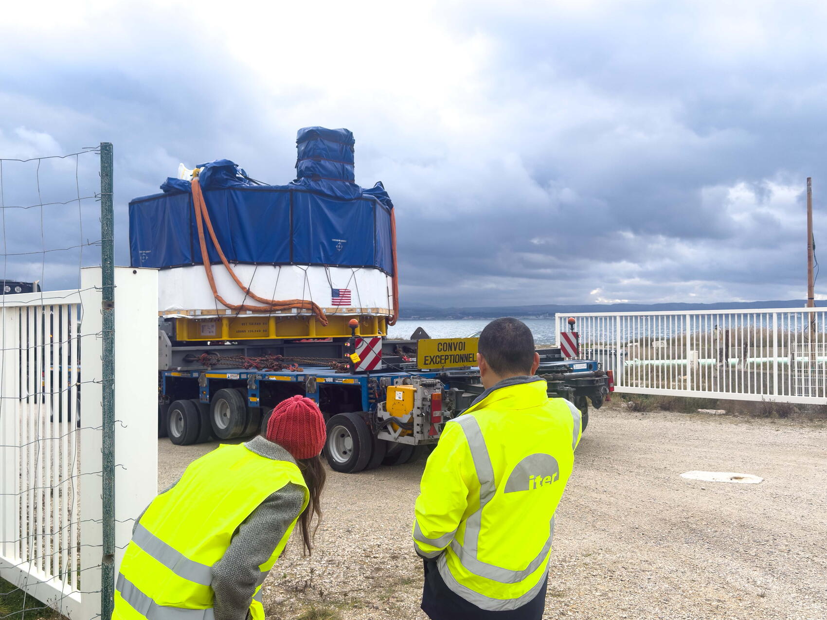 2026-01-13 - US Consul General Jessica Huaracayo and ITER Deputy Head of Construction Taka Omae look on as a 110-tonne central solenoid module is backed up through a narrow gateway at the start of the ITER itinerary. This is the seventh module to arrive from the United States and the last "highly exceptional load" expected as part of US procurement contributions.