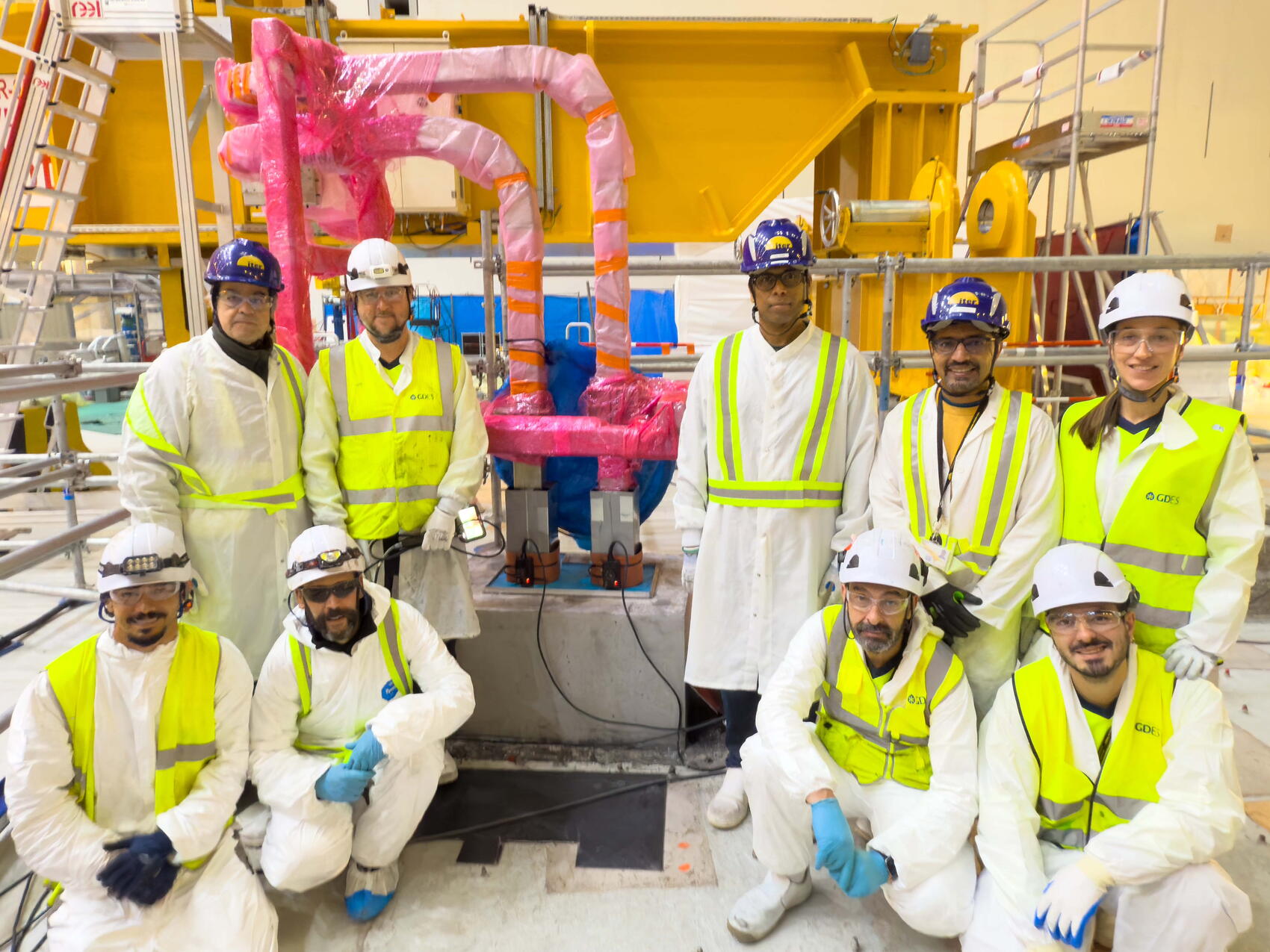2026-02-12 - These members of the CNPE team are photographed during the transfer of vacuum vessel sector #1 into tooling. The CNPE consortium (China Nuclear Power Engineering; China Nuclear Industry 23 Construction Company; Southwestern Institute of Physics; ASIPP; and Framatome) is responsible for sector module sub-assembly and tokamak machine assembly.