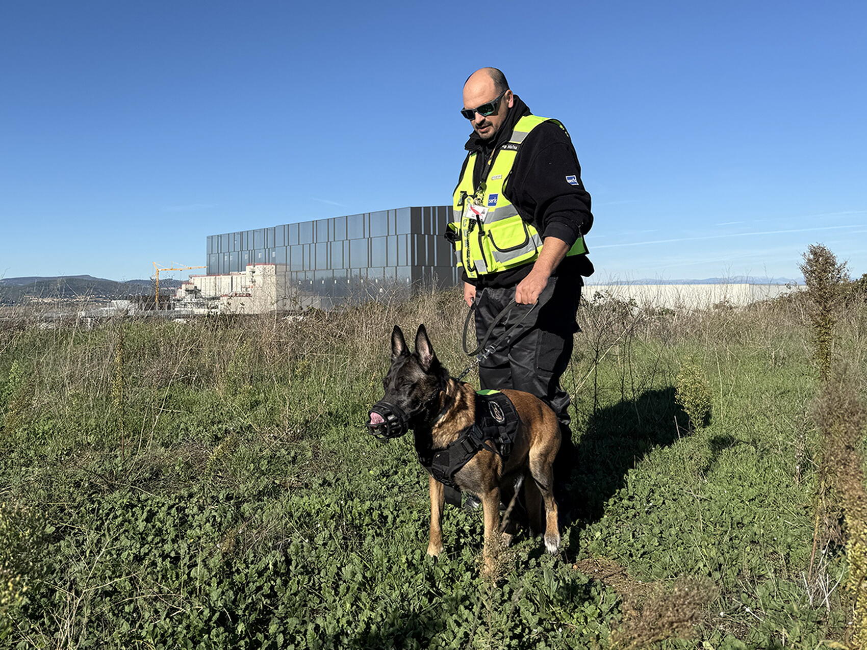 2026-01-26 - Canine patrols may be on the low-tech end of security protocols for the ITER site, but they are integral nonetheless. Here, security officer Gwennael Wartelle and his dog Maïna are out on patrol on a hill behind the Tokamak Building.