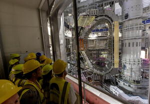 The Holy of Holies: The first of the nine modules required to form the plasma chamber is now in place inside the tokamak assembly pit. Olivier Chenais, of the ITER Nuclear Safety Engineering Section, is explaining the part that lies ahead: how a “little Sun” will be born inside the chamber.