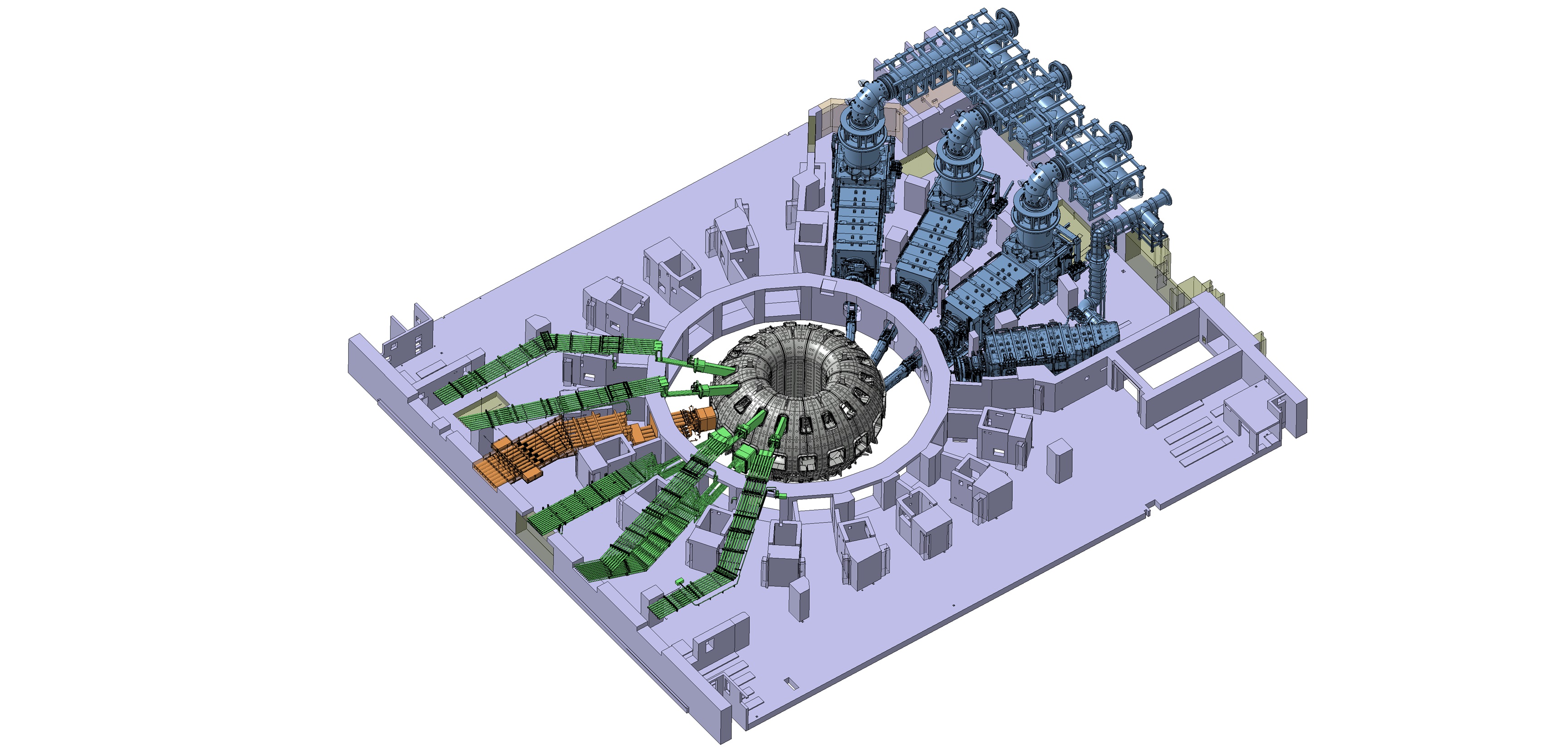 ITER’s heating and current drive systems: electron cyclotron resonance heating (green), ion cyclotron resonance heating (orange), and neutral beam injection (blue).