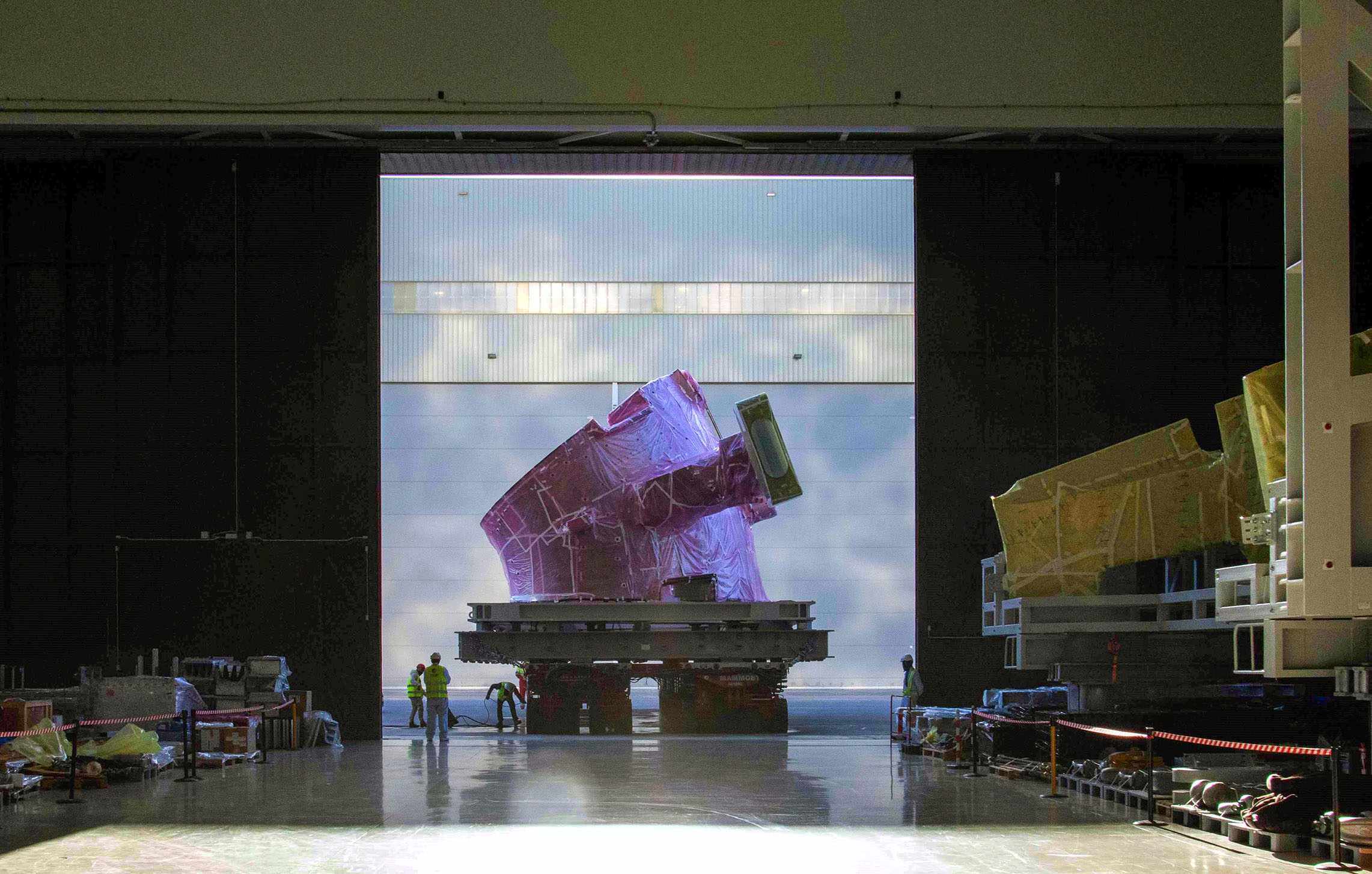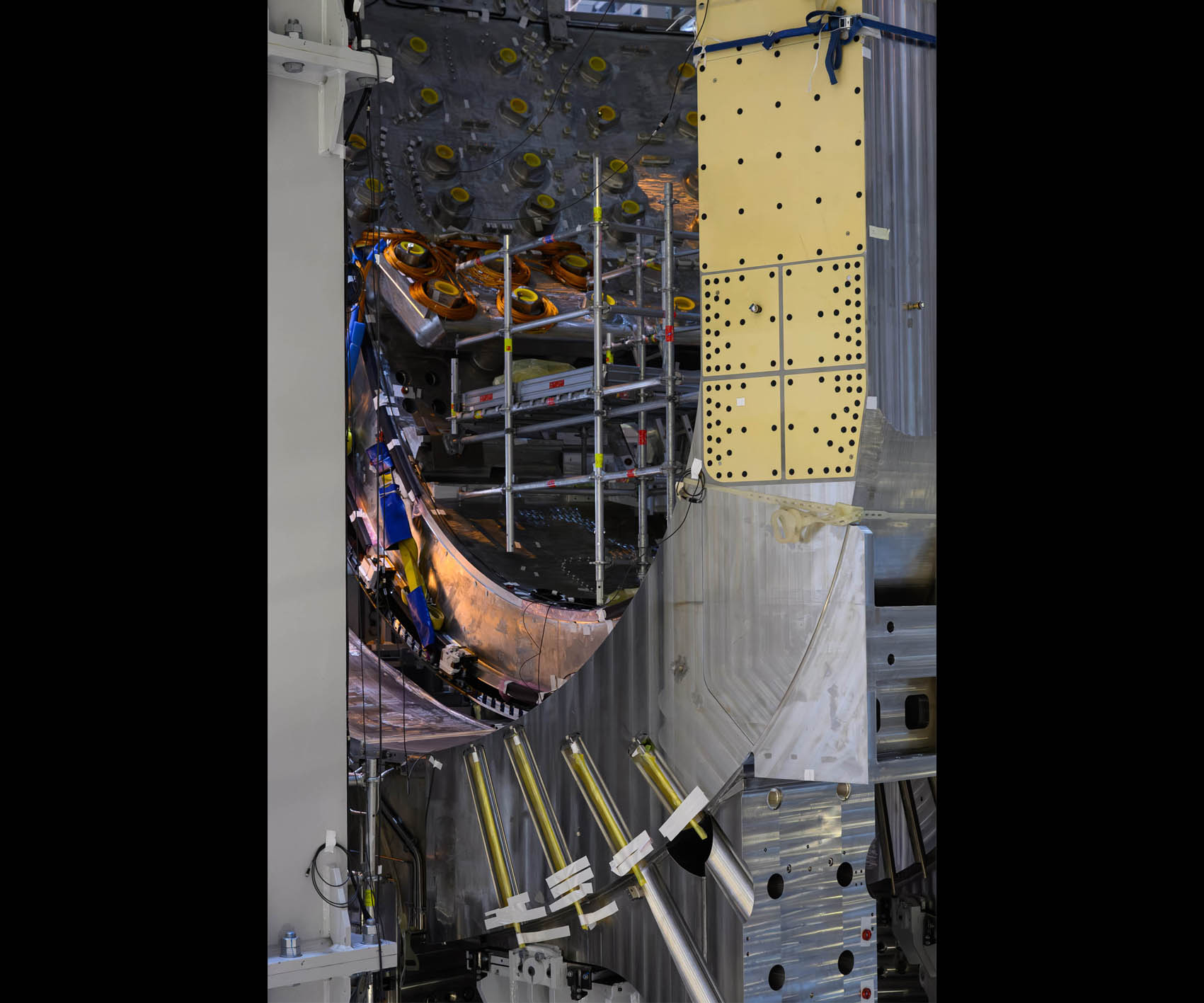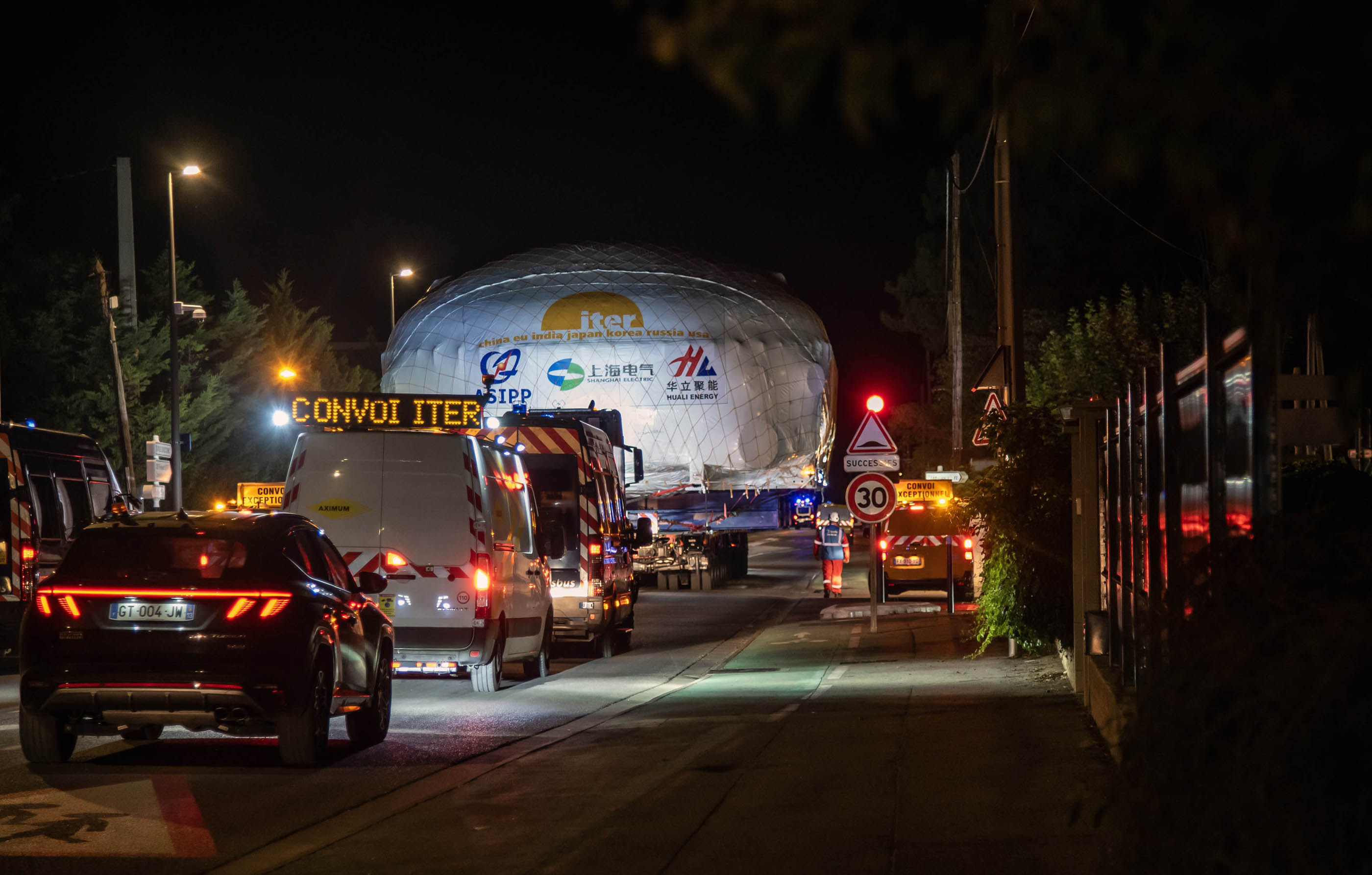 Attached to its rigging, vacuum vessel module #6 has just rotated 90 degrees and is heading towards his final destination in the tokamak assembly pit. This picture was shot from the height of the overhead crane. (Photo Kevin Ballant)