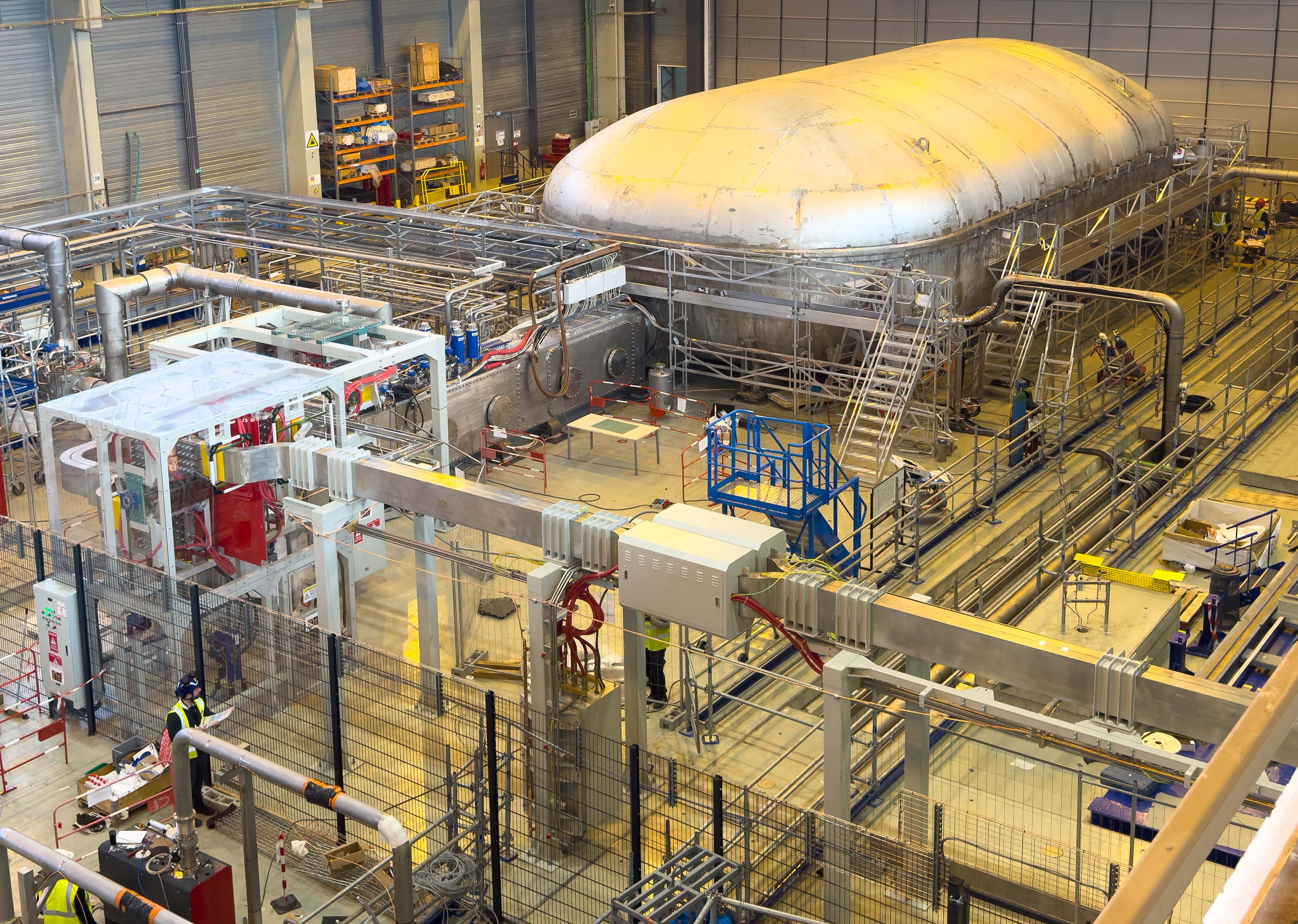 The magnet cold test facility is getting closer to operations. The cryostat was closed around toroidal field coil #7 in December and now high-voltage commissioning of the power converter is underway to be sure the systems are ready to test the magnet at 4 K (minus 269 degrees Celsius). High-voltage commissioning involves the 68kA power supply that will power the facility via the busbar seen in the foreground of the image. Commissioning began on 15 January and the facility should be fully operational at the end of February or the beginning of March 2026.