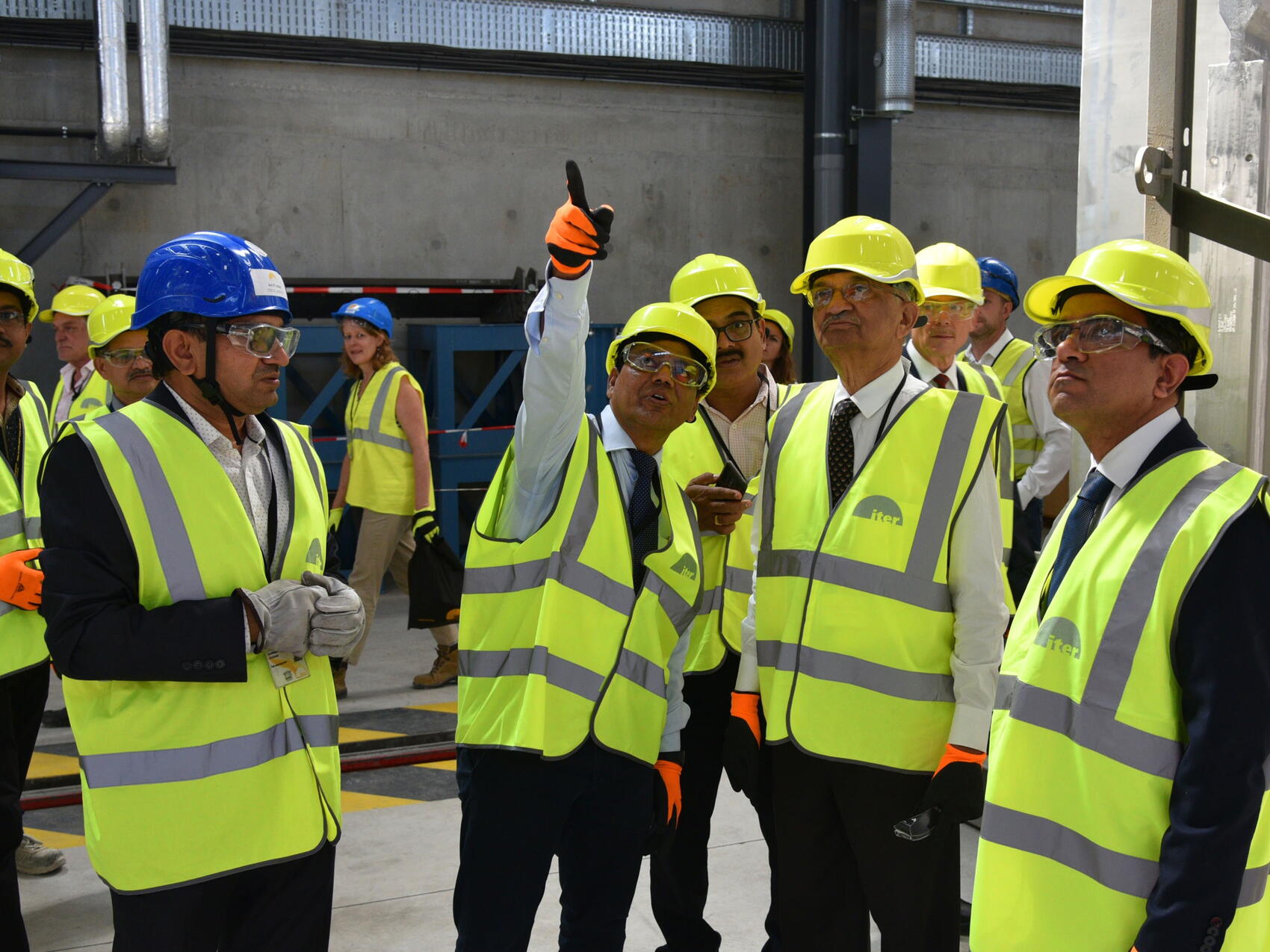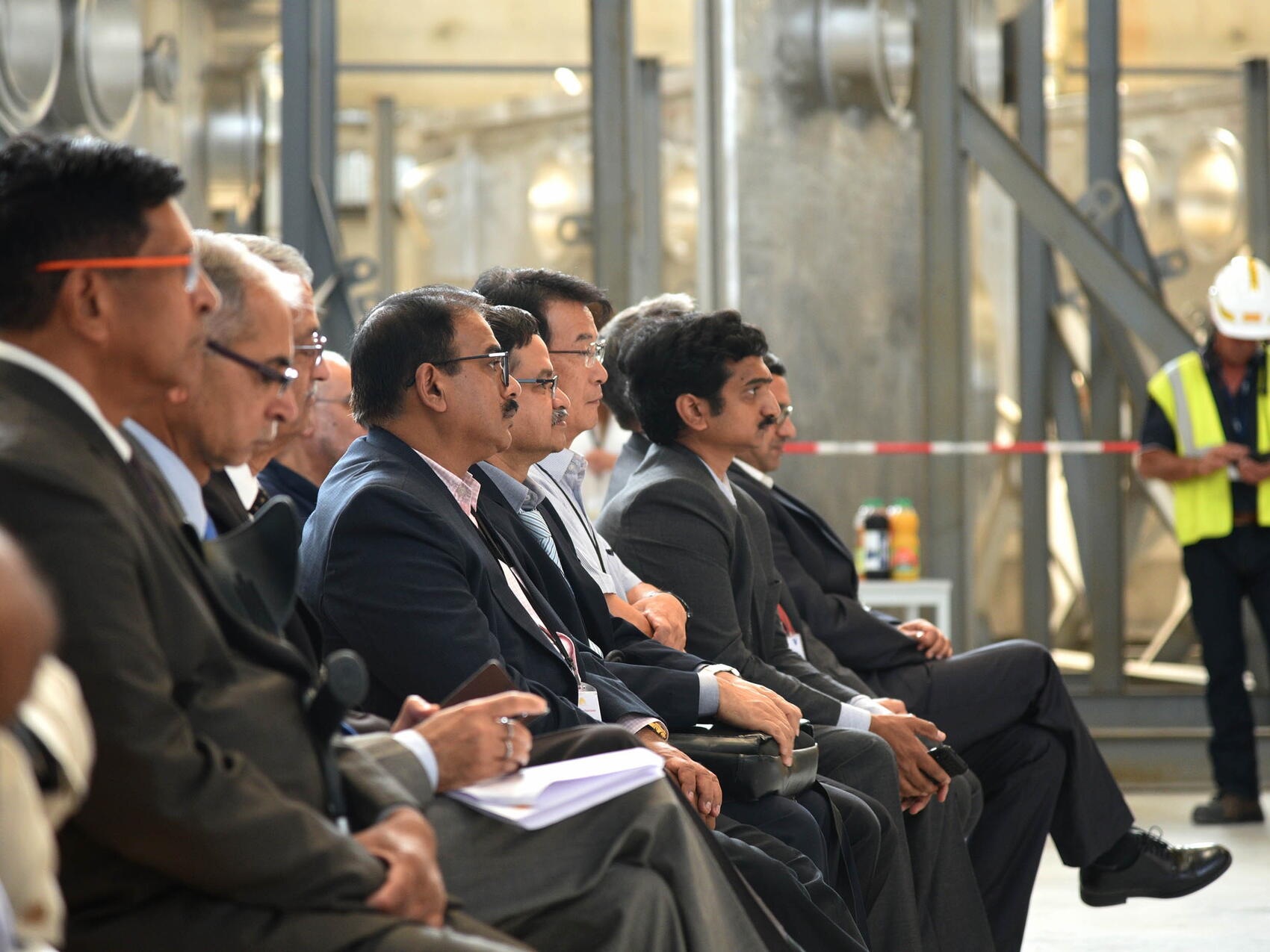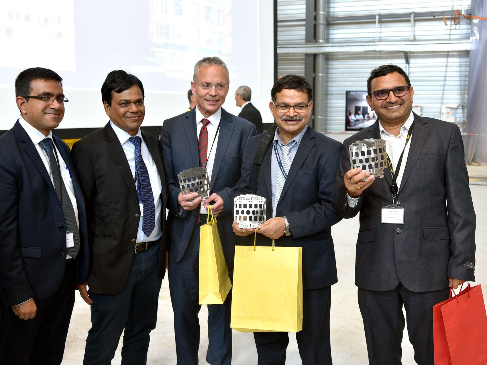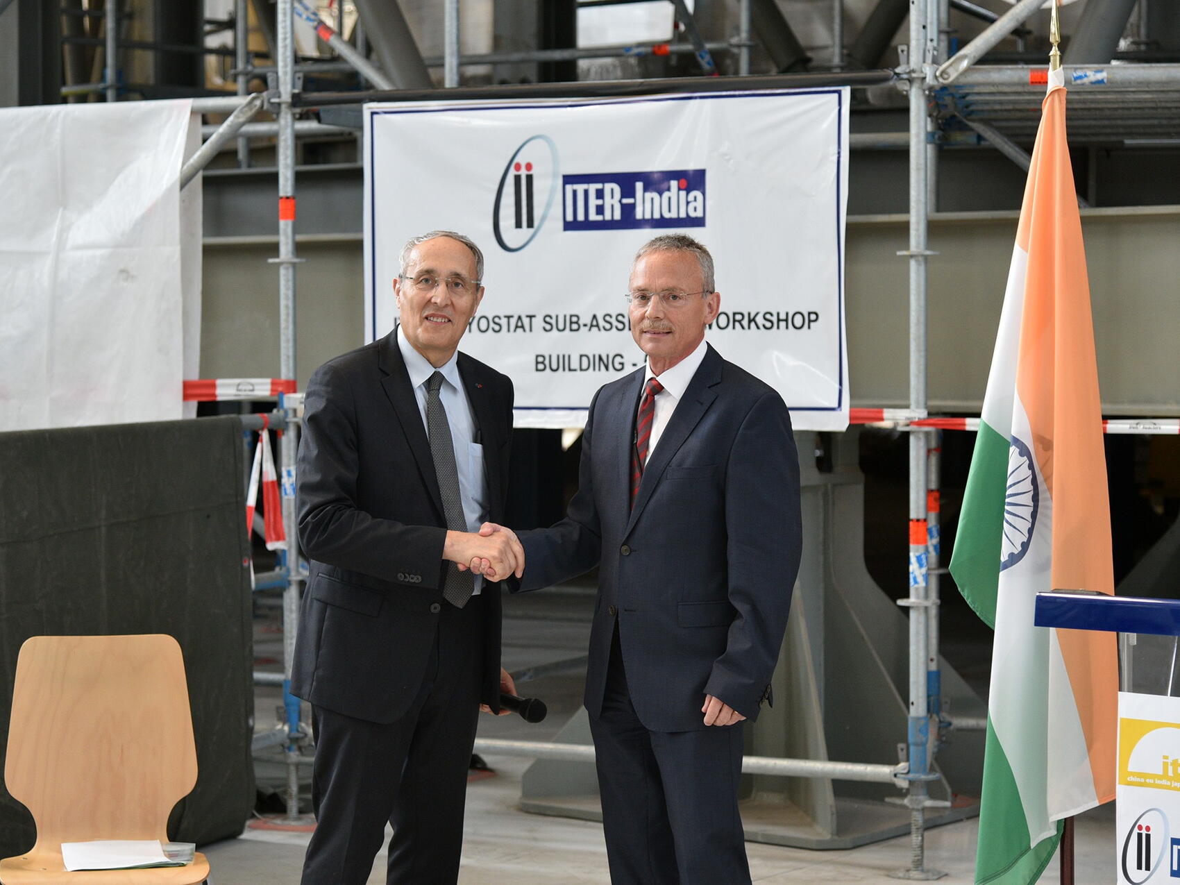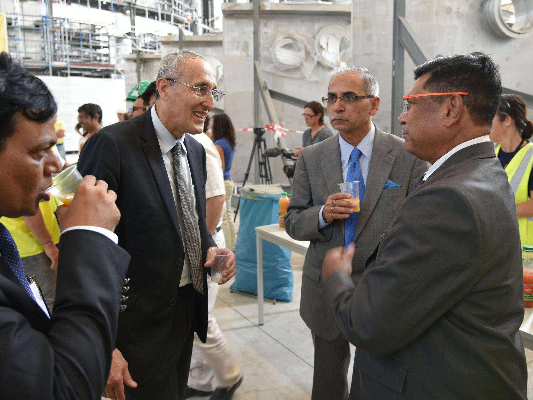 In the Cryostat Workshop, where the India-procured component is assembled and welded, ITER Director-General Bernard Bigot, India's Ambassador to France Vinay Mohan Kwatra, and the former chairman of the Atomic Energy Commission of India, Anil Kakodkar, symbolically smashed a bottle of French champagne on a large chunk of steel representing the ITER cryostat.
