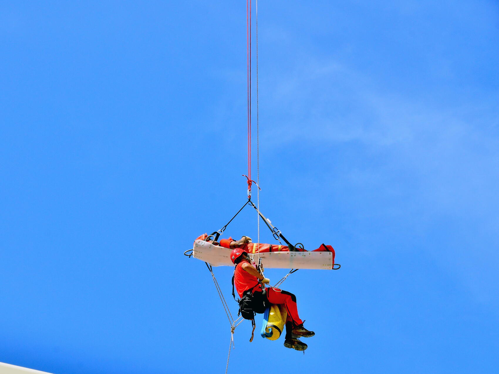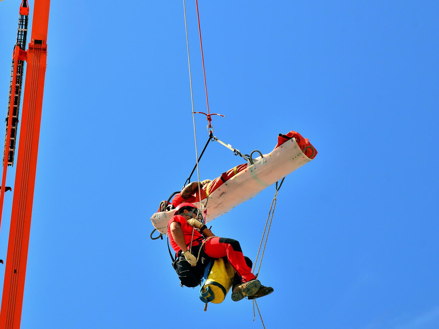While the specialized unit was on its way, the Emergency Response Team had reached the stranded worker in a second air lift. Their mission was to secure the worker and to assess his condition. The worksite nurse followed to perform the first response actions needed to stabilize the victim.