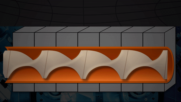 Evacuating this heat requires an innovative "active cooling" process, in which pressurized water is pumped through copper alloy tubes running through the monoblocks. As twisted copper rods twirl through the tubes, heat is conducted away from the plasma-facing components into the water and carried away. Water enters at a temperature of 70 °C and exits at 120 °C—and yet it is essential that it does not boil, which would reduce its ability to absorb and remove heat.
