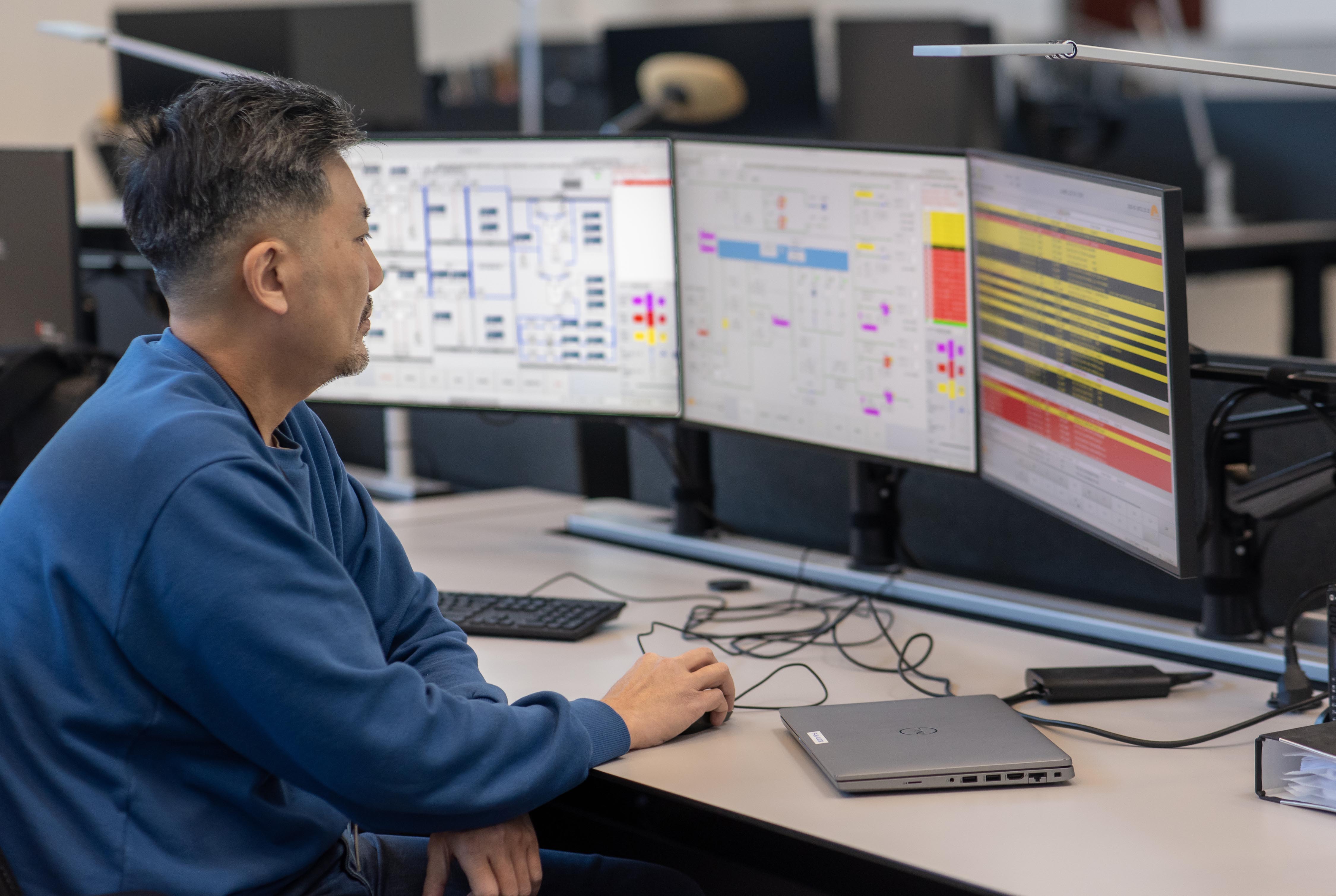 Rossella’s mission, as shift operation manager, is twofold. One is to monitor the beat and pulse of the installation’s systems and, in case of a warning or an alarm flashing on one of the screens, authorize the shift operator sitting at the nearby desk to intervene. Depending on circumstances this can mean remotely starting or stopping a system, or adjusting its parameters to respond to a client’s need.