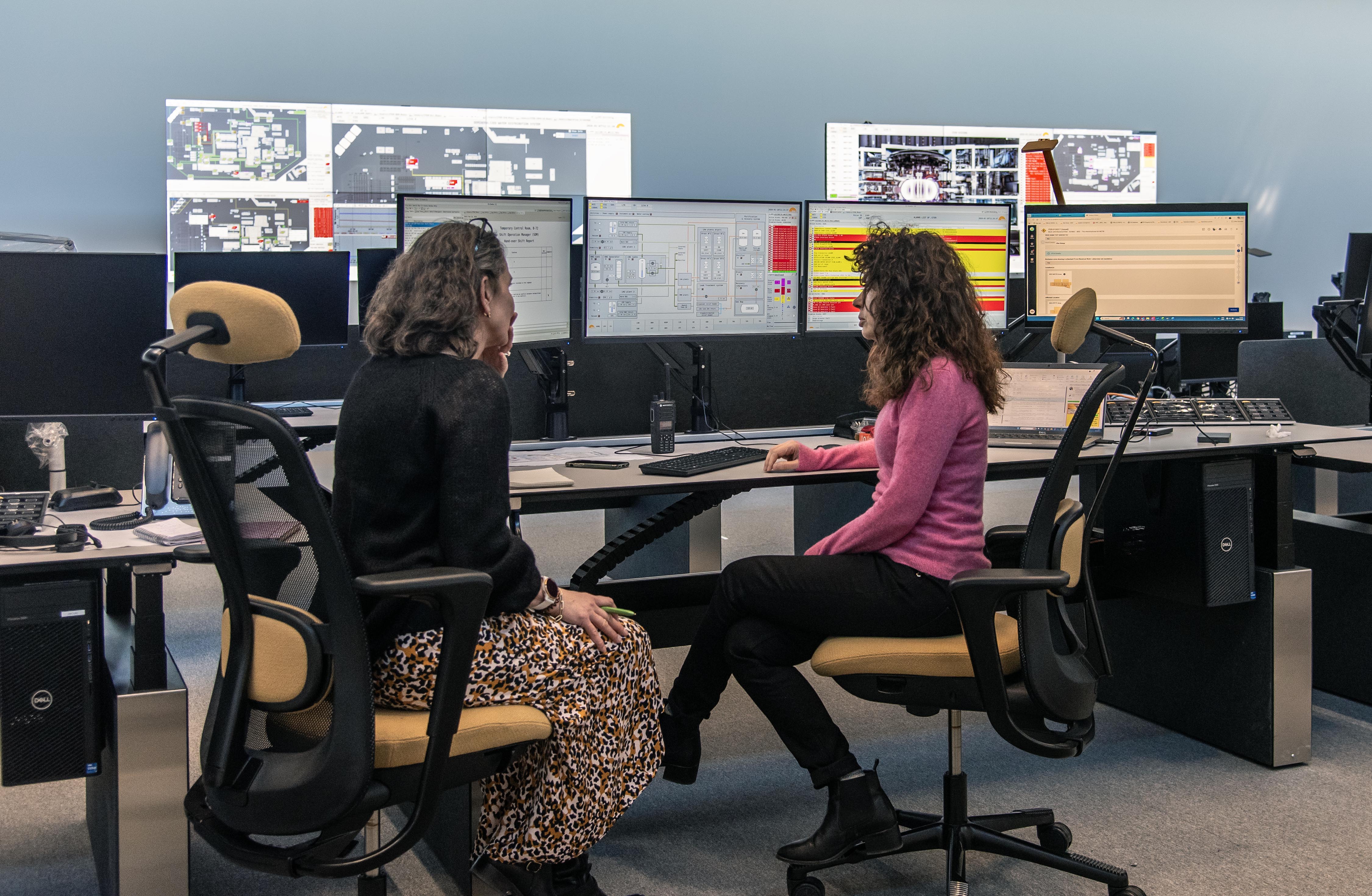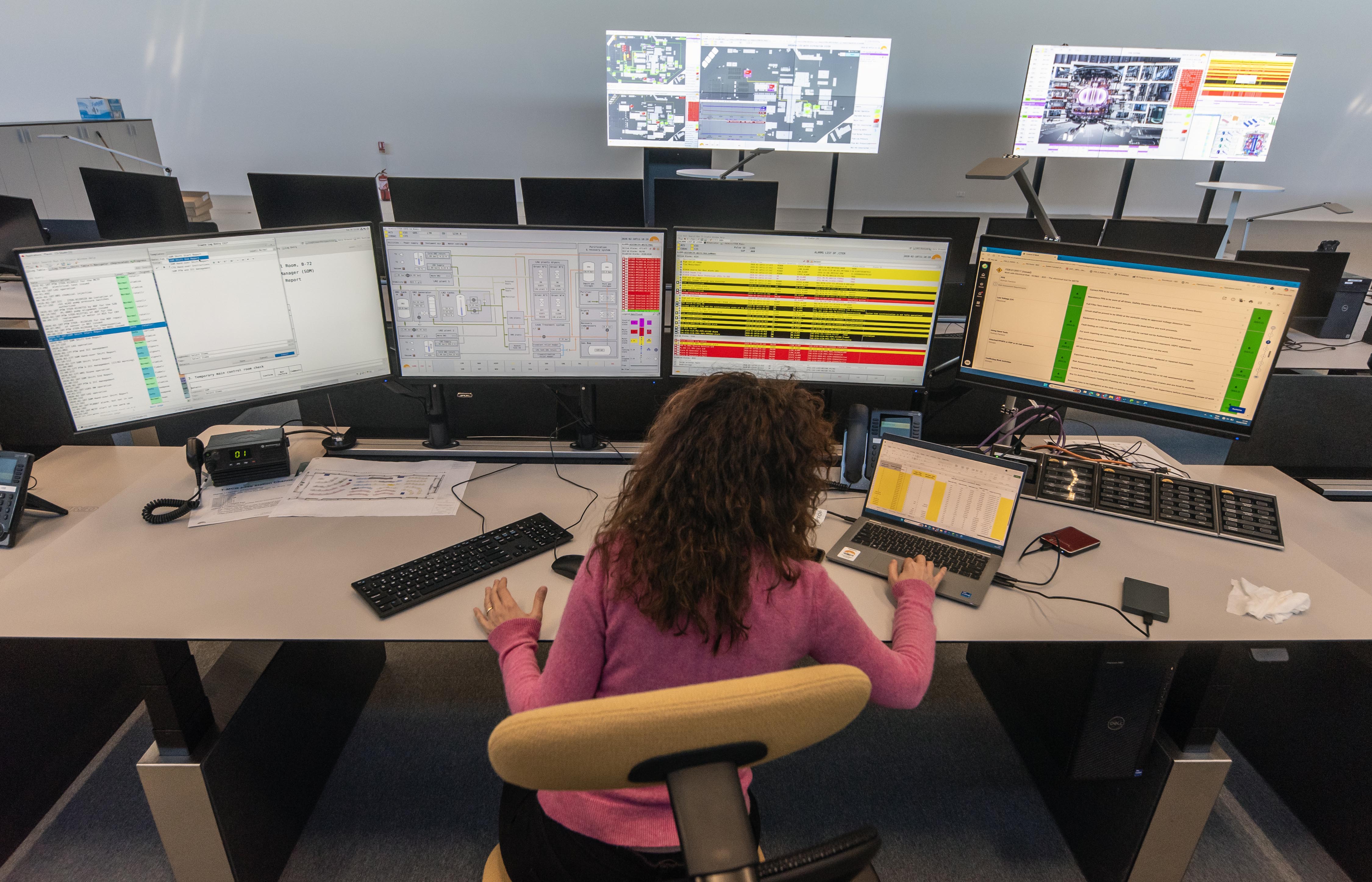Facing four large screens on her desk, plus an extra one on her laptop, Rossella Rotella has her finger on the installation’s pulse. Besides being in charge of the Tritium Breeding Blanket Project, Rossella is one of a dozen specialists from different ITER units who devote part of their time to managing shift operations in the ITER control room. A few desks away from her, principal shift operator Vladislav Kim keeps a close watch on a variety of systems, some already active, others still in the commissioning phase. Besides them, the 750-square-metre space on the first floor of the Control Building is empty.