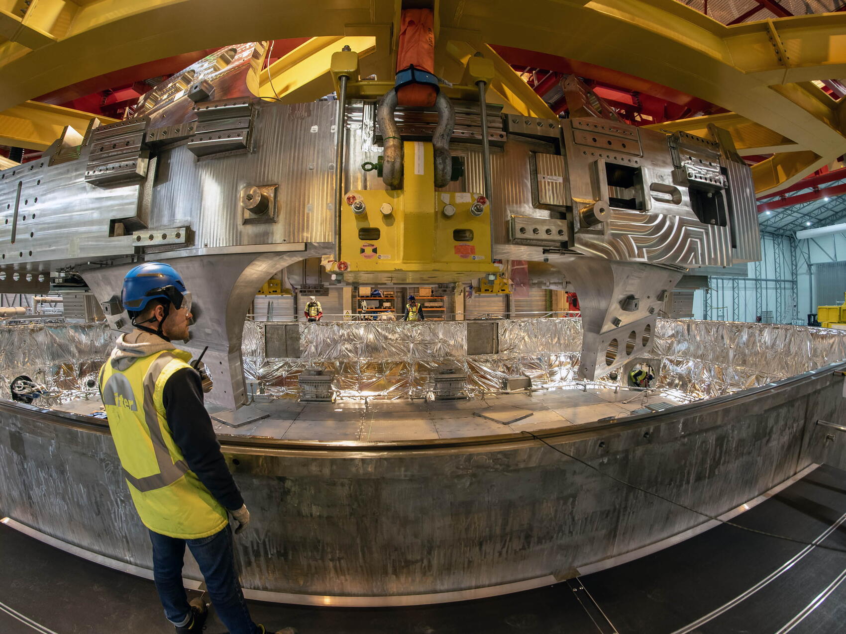 For toroidal field coil #7 (TF07), winter will be short but exceedingly harsh. For one full month, the ~ 300-tonne component will be enclosed in a steel cocoon, its temperature brought down to 4 K (minus 269 degrees Celsius)—an environment as cold as that of deep space. On Monday 15 December, the big red tower crane that had handled the ITER poloidal field coils in the final stages of their fabrication carefully deposited TF07 in the sardine-box-shaped cryostat, the central element of the recently finalized magnet cold test facility.