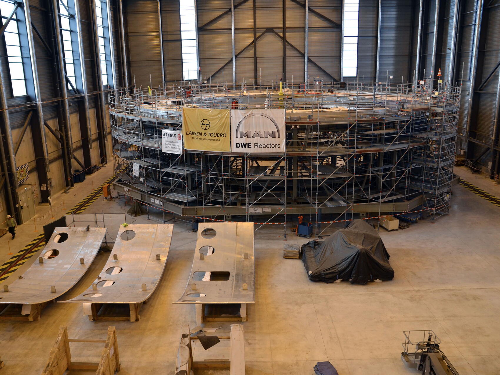 The assembly of the cryostat has been underway since September 2016, when teams of welding specialists began assembling the pie-slice-shaped segments of tier one of the base. Work began in 2017 on the lower cylinder and today, the fabrication of both lower sections has advanced to the final activity stage under Indian contractor Larsen & Toubro (manufacturing design, fabrication and assembly) and sub-contractor MAN Energy Solutions (welding).