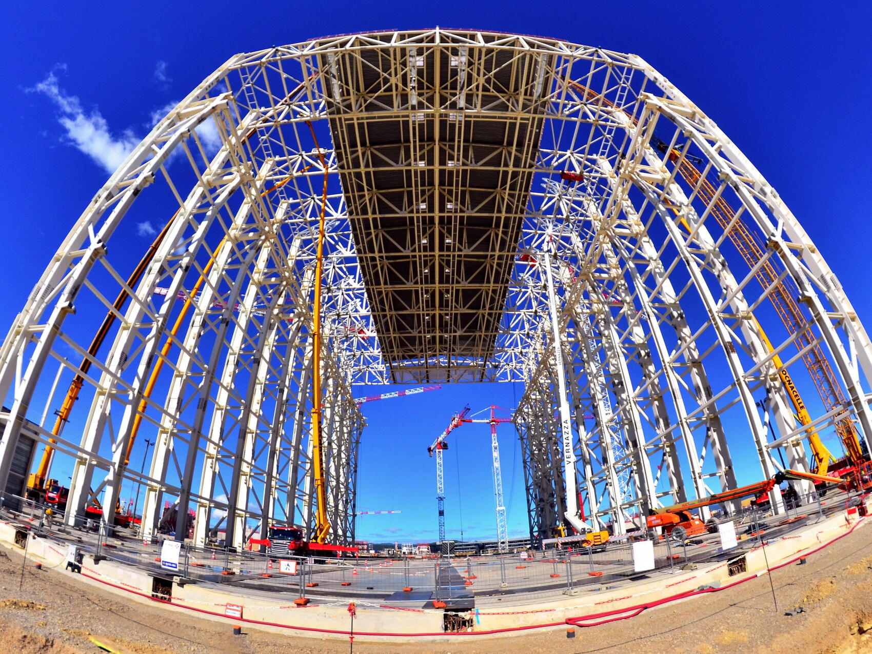 2015-10-07 - A giant, 22-legged arachnid seems to have taken residence on the ITER site ... Following the roof lifting operation on 11 September, the temporary structures that held the hydraulic jacks have been removed and workers have nearly finished tightening 3,000 connexion bolts. In the bottom left hand corner a piece of cladding is visible, part cladding trials currently underway.