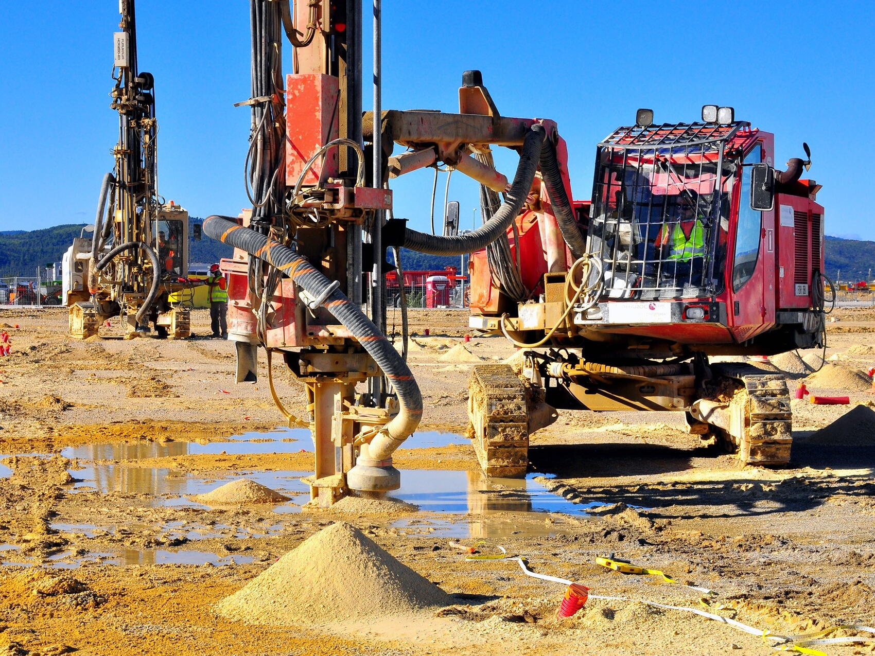 2015-10-07 - Preparatory works have begun for the buildings that will house the giant magnets power conversion units. Like for all other buildings the process kicks off with "soil investigation," where long drill bits are pushed as much as 15 metres below the surface in order to identify possible discontinuities or cavities created by water erosion (karsts). Holes are bored approximately every five metres.