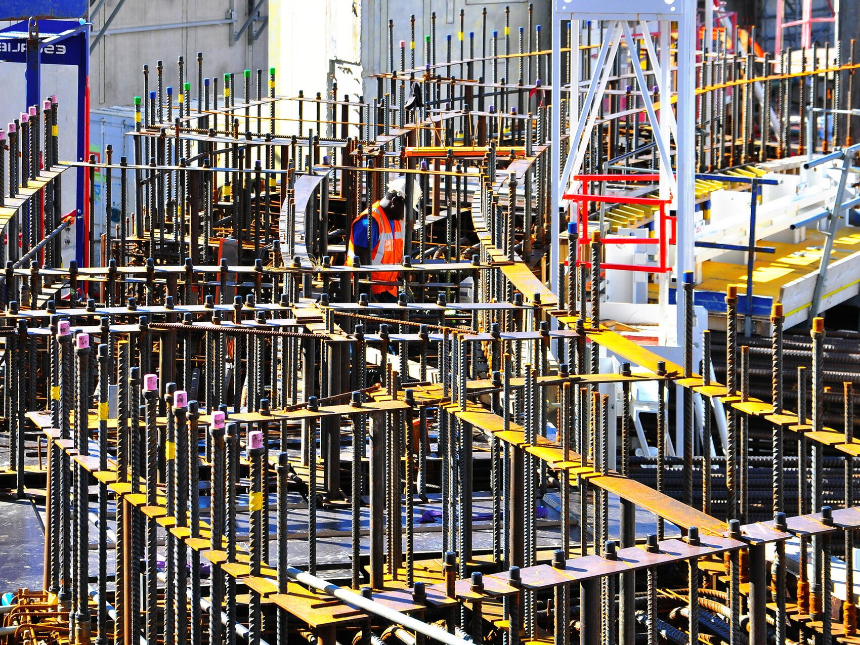 2015-10-07 - Plastic caps of many colours (according to the diameters of the steel bars) protect the couplers that will ensure the vertical continuity of the bioshield's steel reinforcement.