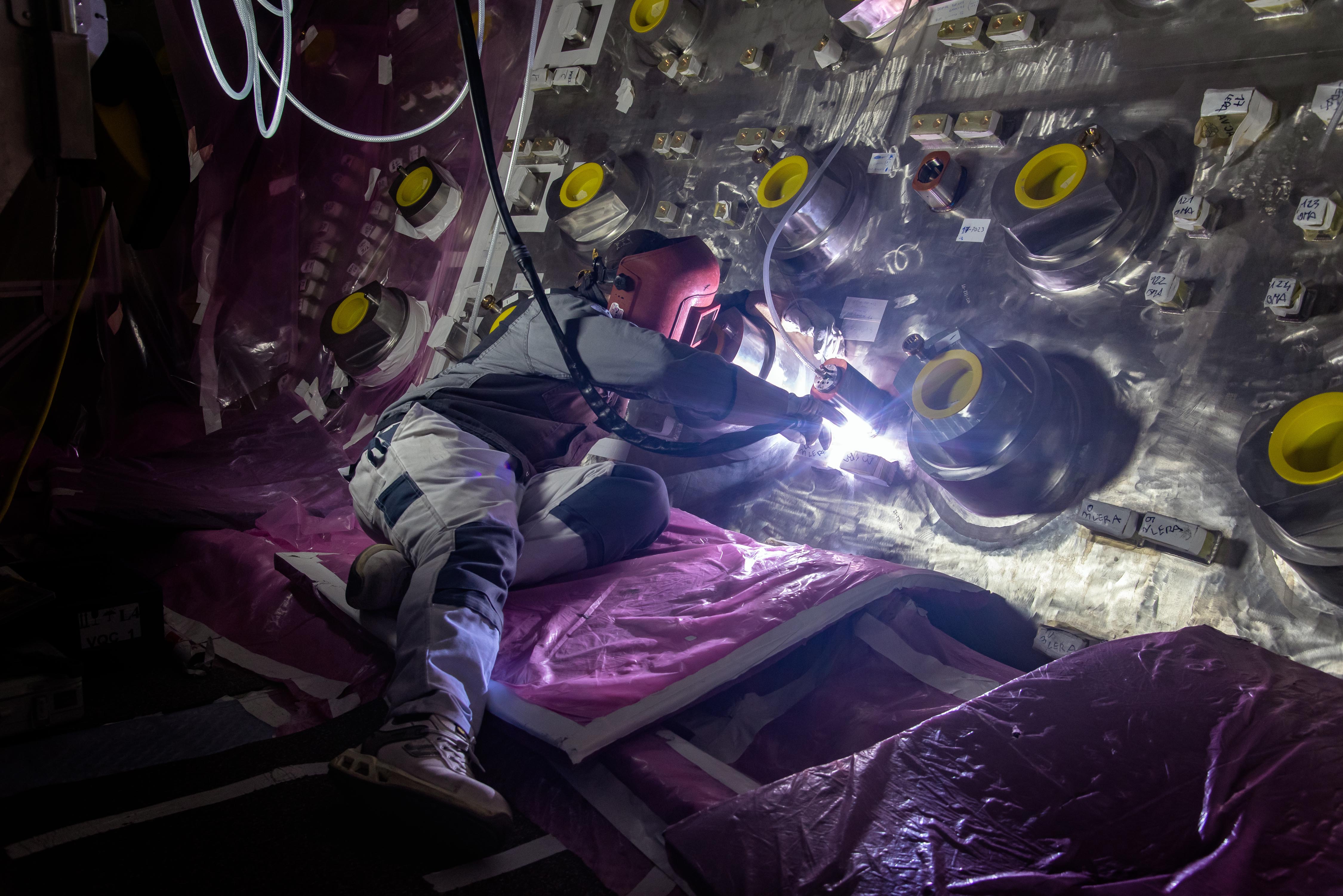 One by one, the bosses for magnetic sensors are welded to the vacuum vessel’s inner surface. There are approximately 2,000 such supports per sector.