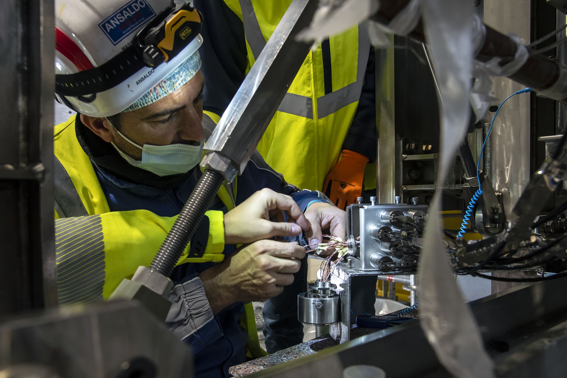 Standing on the scaffolding or crouching under the coils, several teams are at work. Members of the DYNAMIC SNC consortium (one of two machine assembly contractors) they are busy installing the delicate network of the external cooling circuit (130 metres of thin piping), connecting the low-voltage wires for the diagnostics systems, or match-drilling for various interface elements.