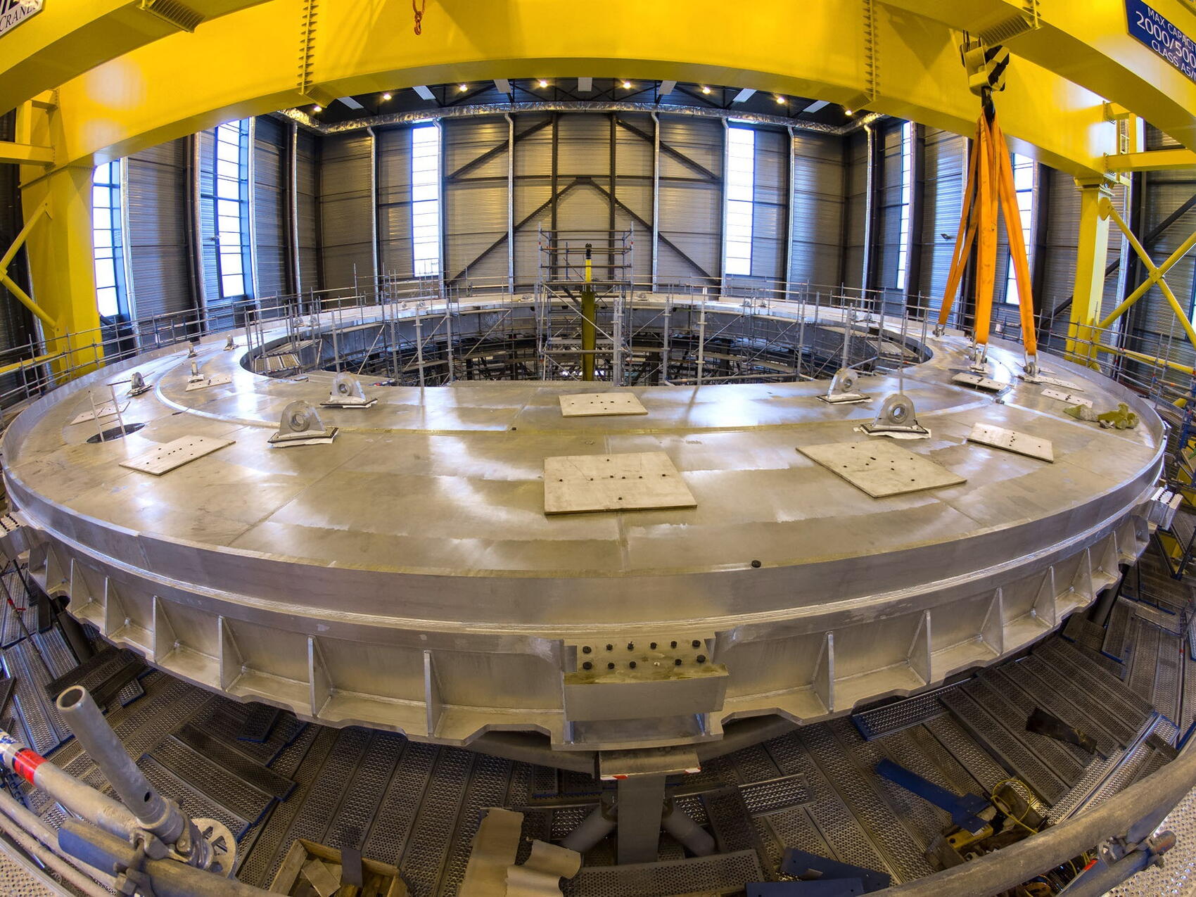 In the Cryostat Workshop on site, two sections of the cryostat are now in assembly in tandem. Here, the team stands inside the ring of the lower cylinder, tier one (30 metres in diameter). An initial pass of the welding tools has all segments now joined; the second tier segments—en route now from India—will top the first, creating a 10-metre-high structure.