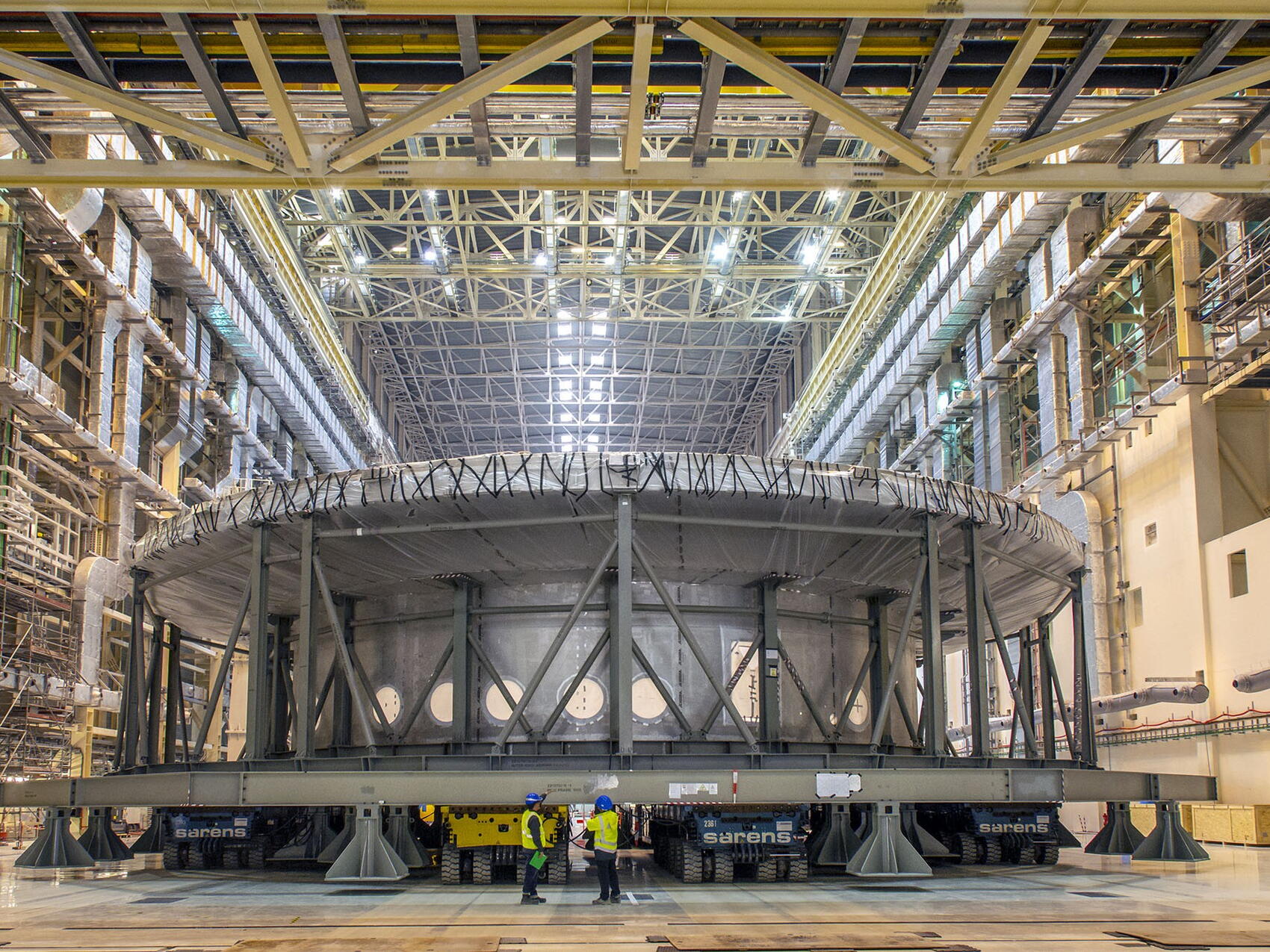 Once inside the Assembly Hall, directly underneath the beams of the overhead crane, the 1,250-tonne base section appeared ready to undertake the 170-metre-long journey to the mouth of the Tokamak pit.